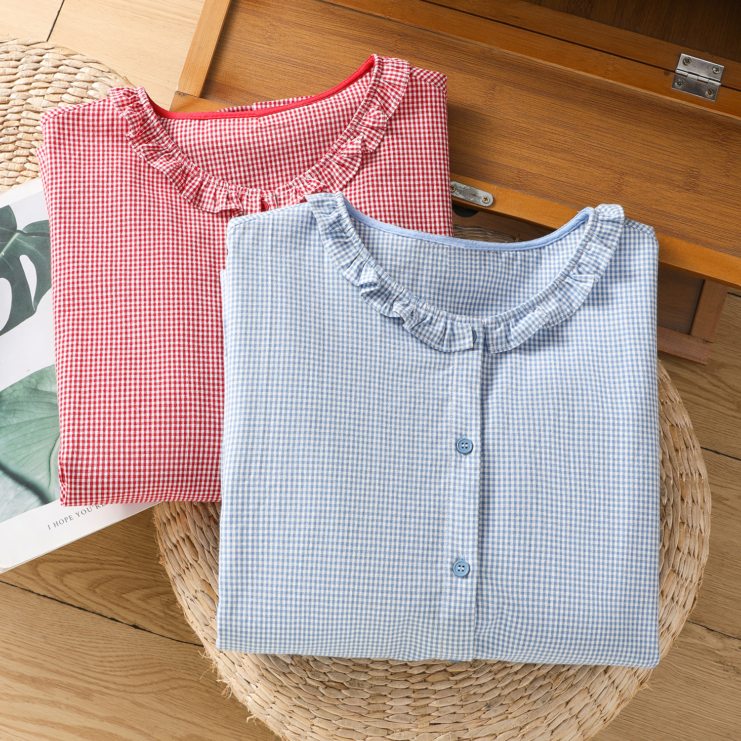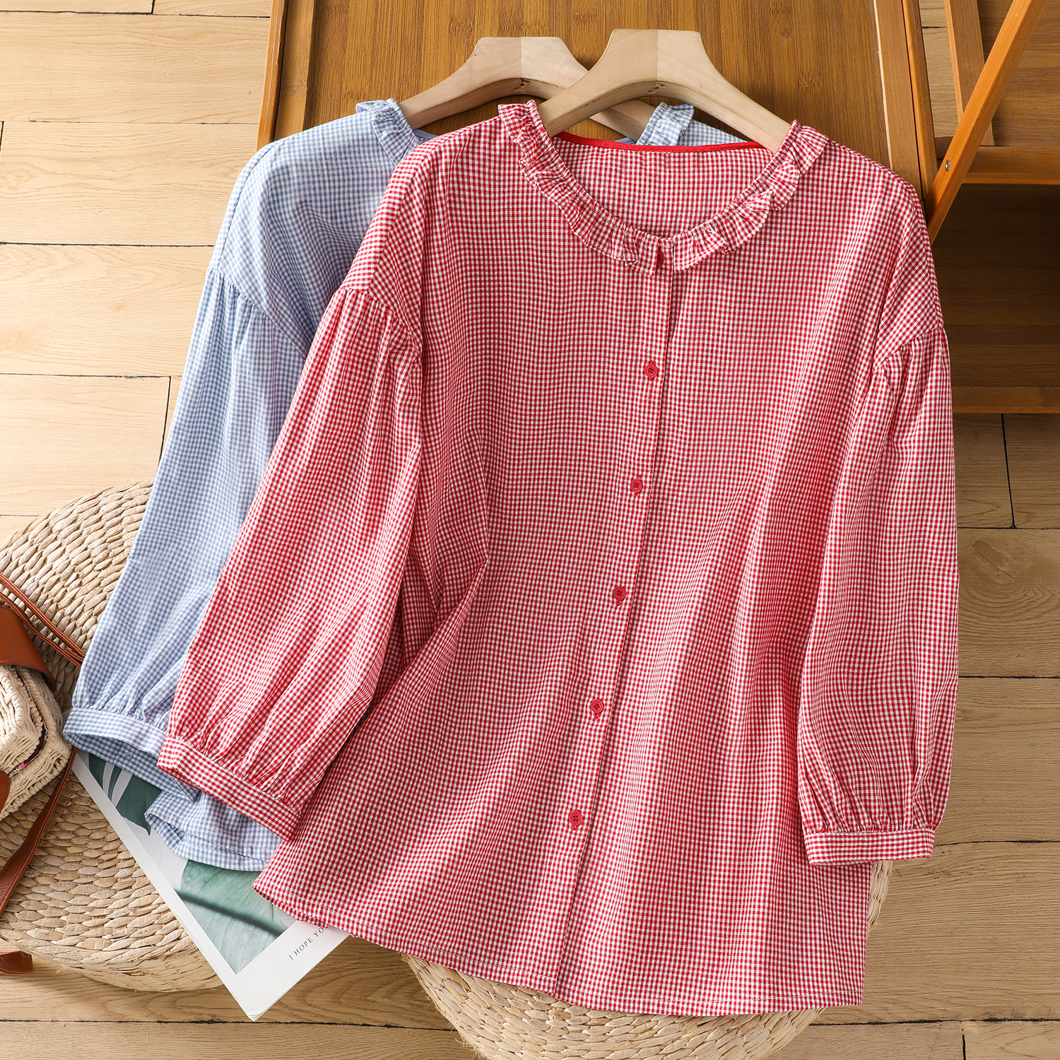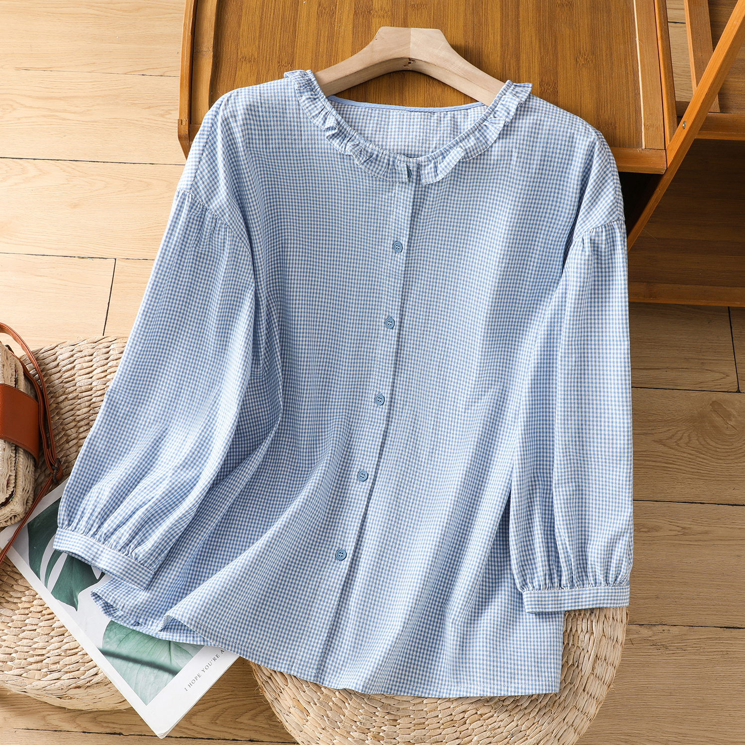 蓝白格衬衫女春夏季日系休闲纯棉花边领格子七分袖衬衣上衣女格子