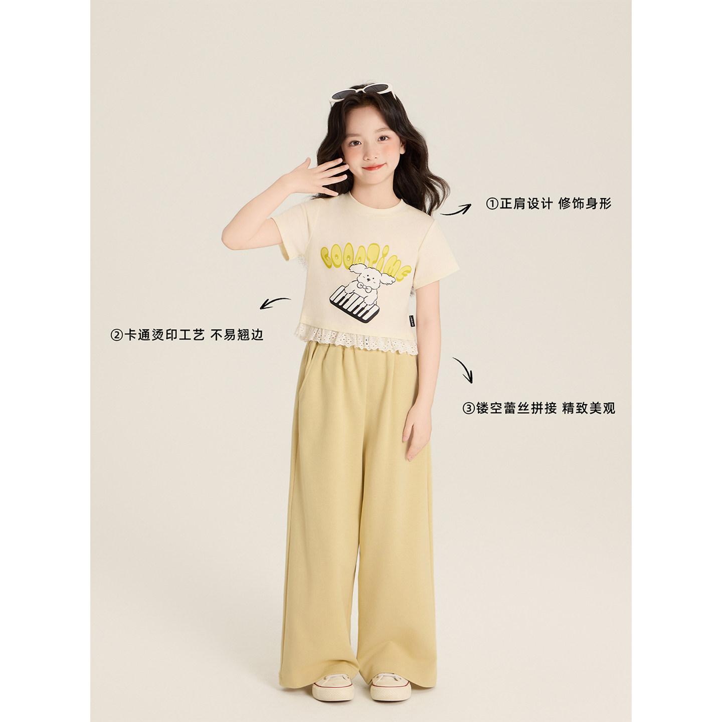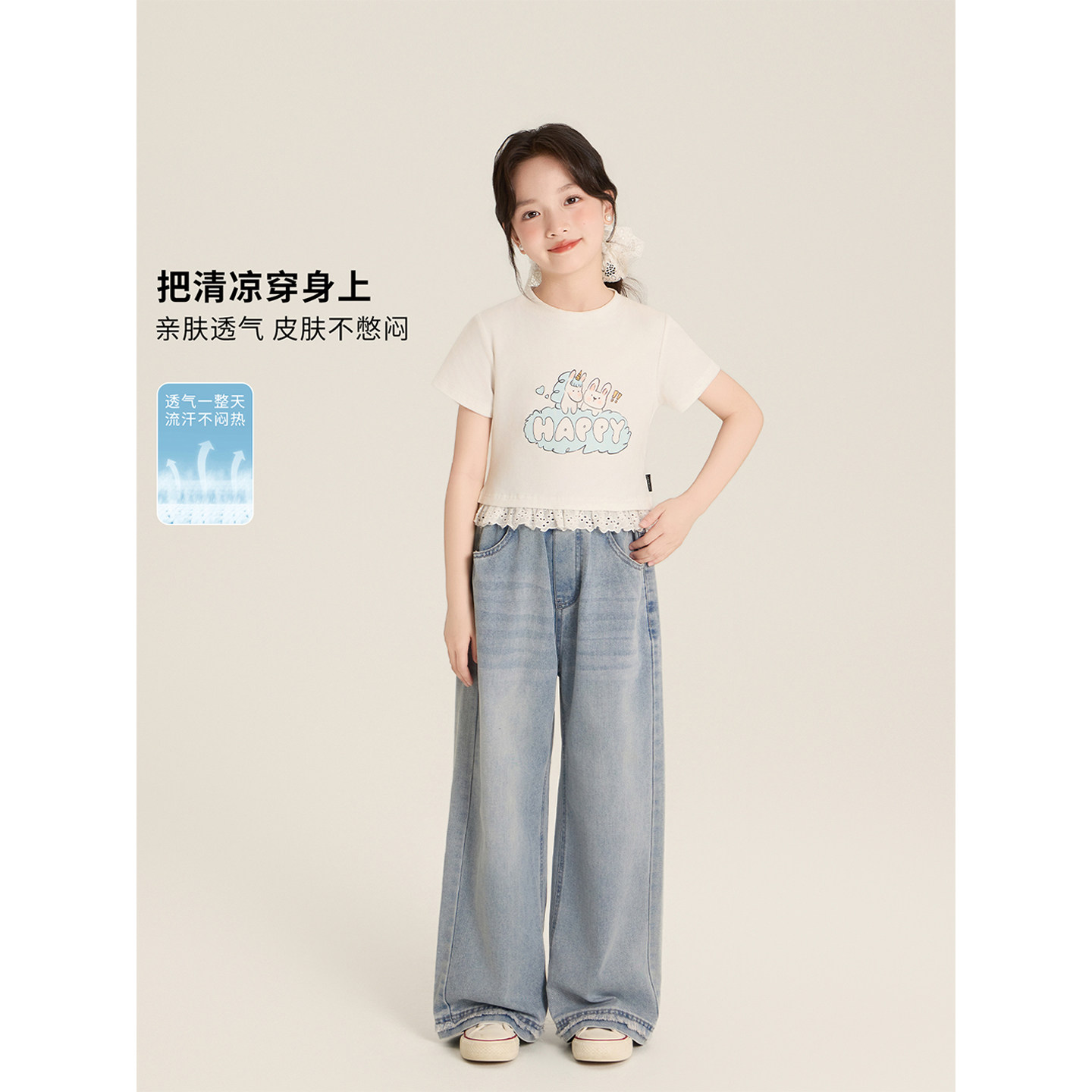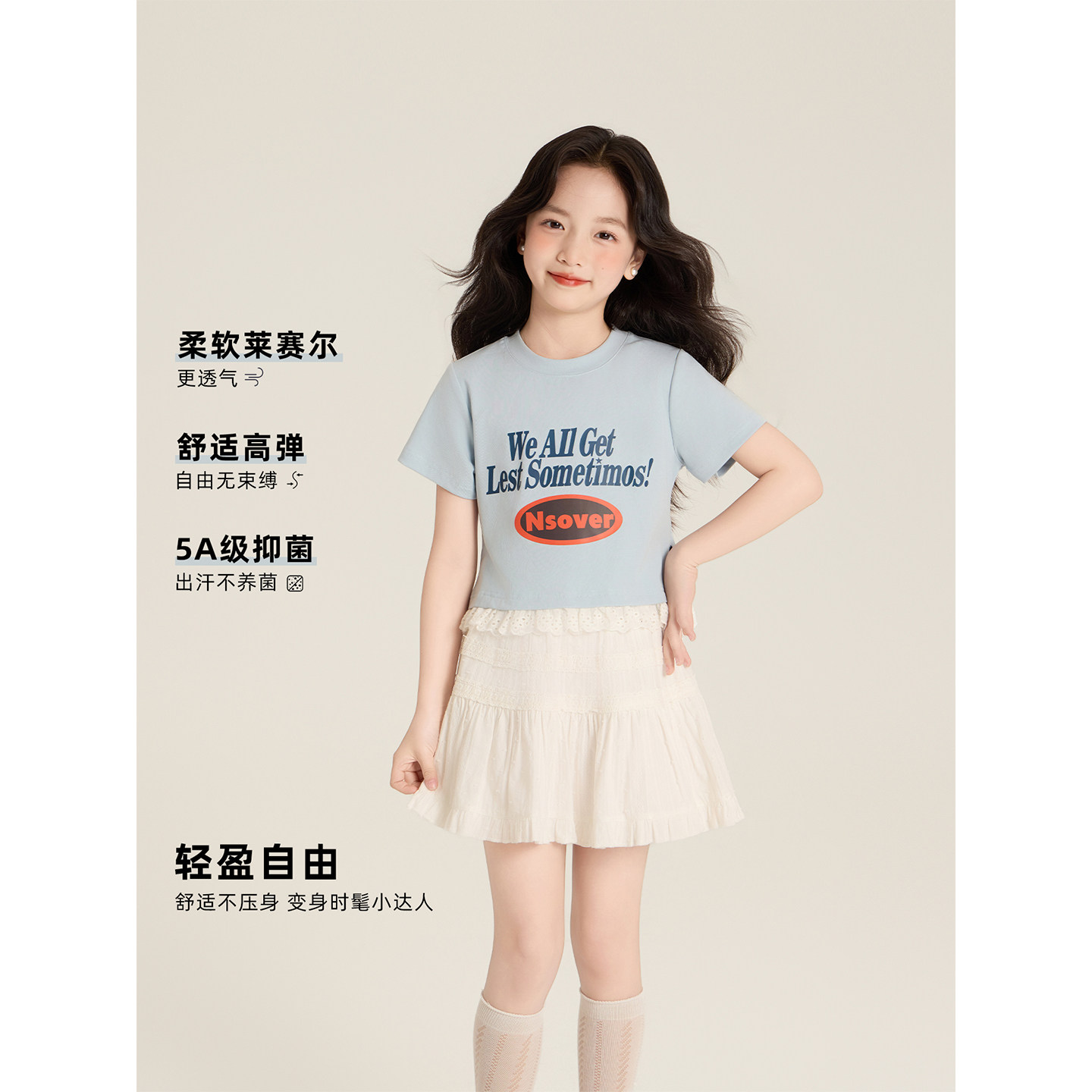 Amybaby女童上衣夏季2025新款假两件休闲撞色蕾丝花边短袖T恤
