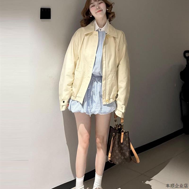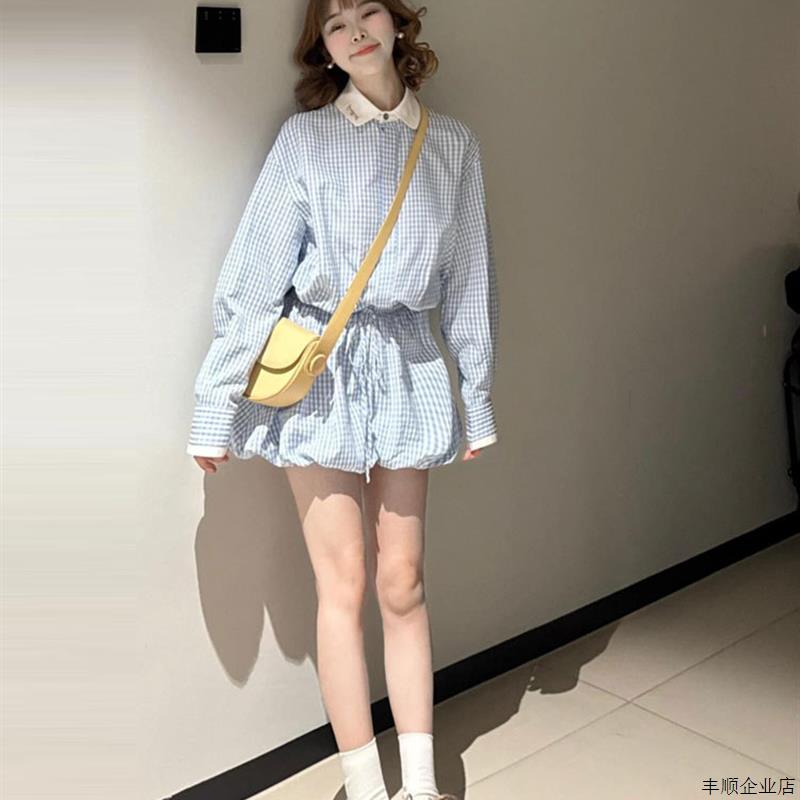 韩系甜辣妹格子翻领长袖衬衫上衣女小个子花苞半身短裙两件套秋季