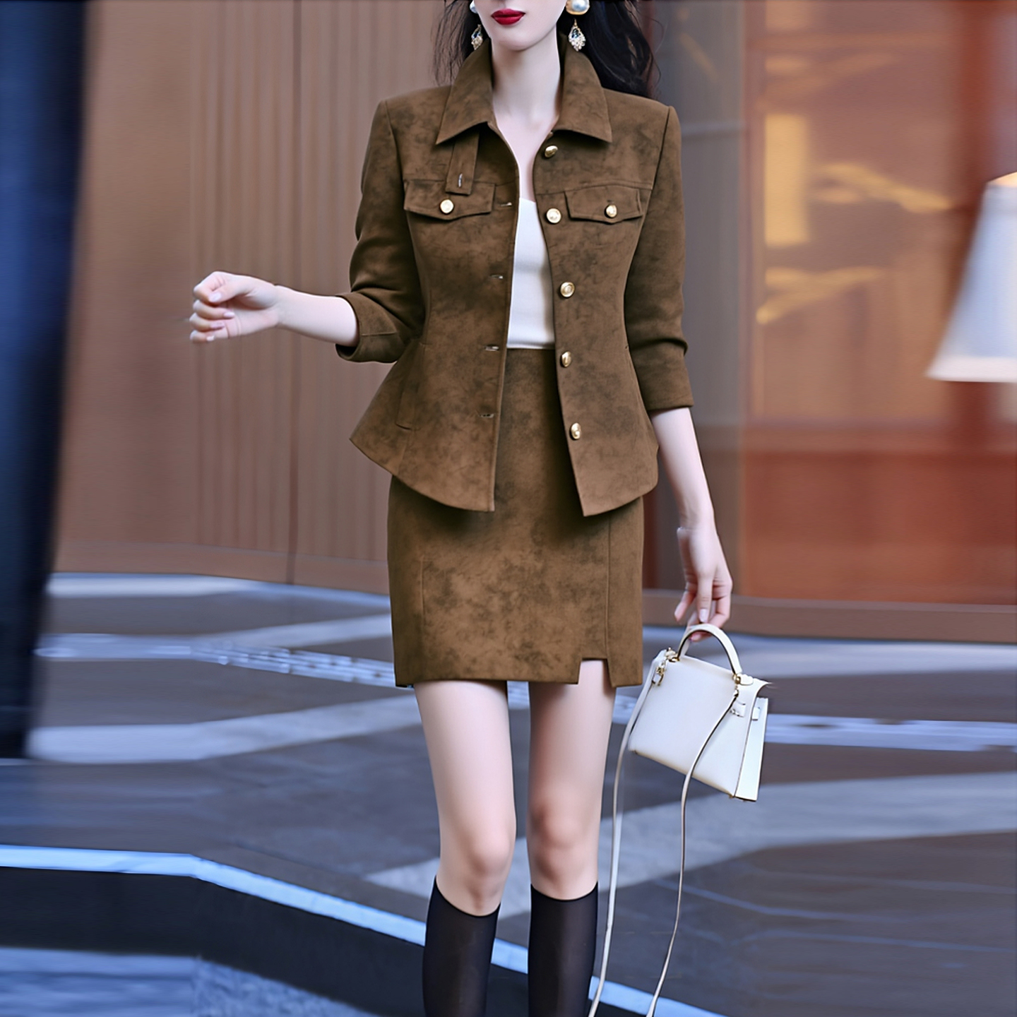 时尚麂皮绒套装裙女2025冬季新款显瘦时髦短外套半身裙工装两件套