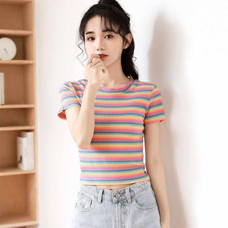 短款露脐上衣女彩虹条纹紧身漏肚脐打底衫泫雅风露腰短袖高腰t恤
