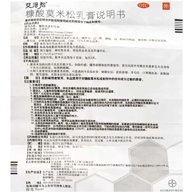 艾洛松糠酸莫米松乳膏15g皮炎湿疹皮肤瘙痒症