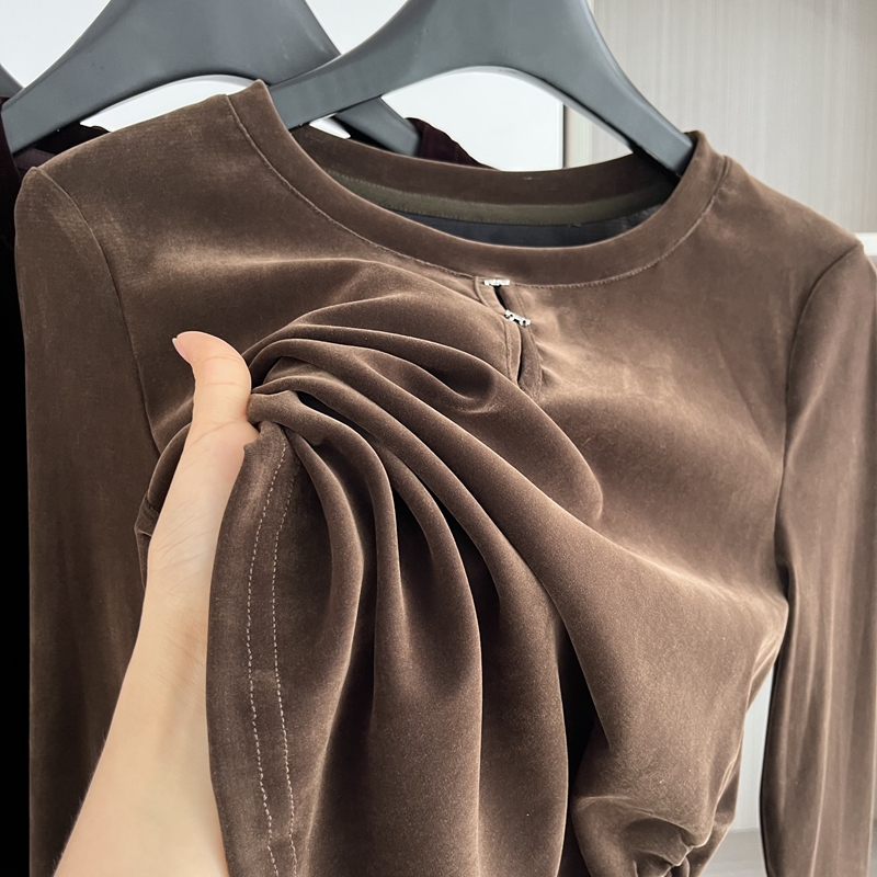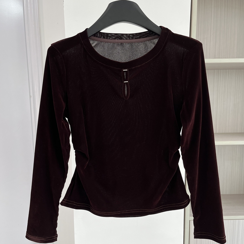 高级感丝绒25早秋新款长袖圆领T恤女修身收腰百搭打底衫短款上衣
