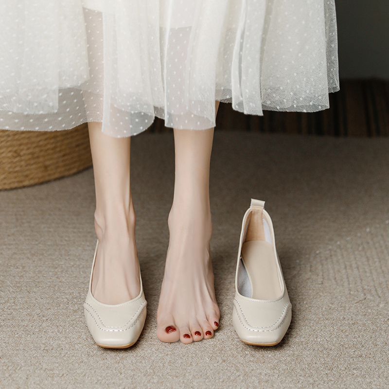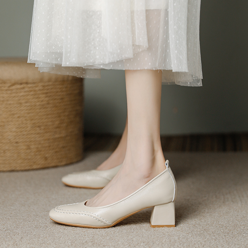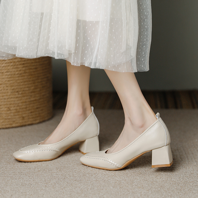 米白色5厘米真皮方头粗跟高跟鞋女2024春秋配裙子单鞋浅口工作鞋