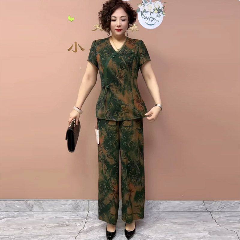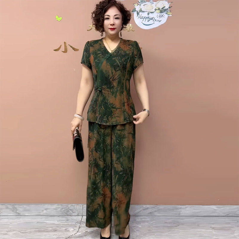 夏季中老年妈妈装真丝阔太太短袖衬衫+阔腿裤宽松桑蚕丝两件套装
