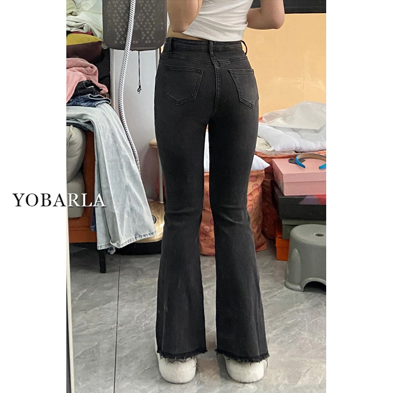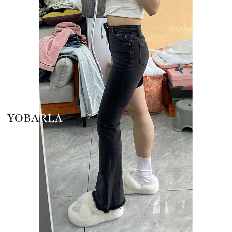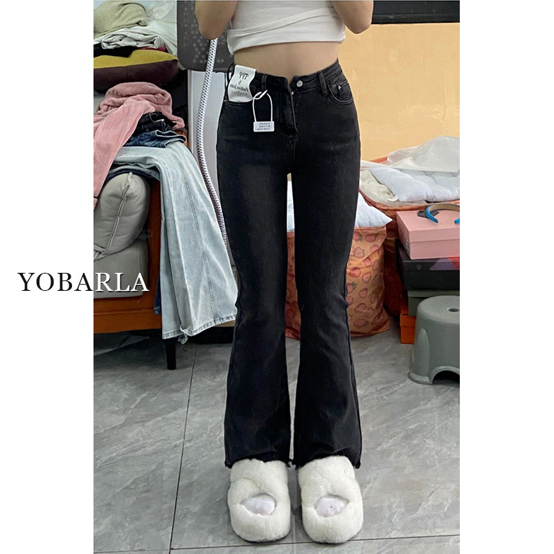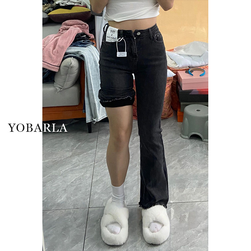 黑色毛边微喇牛仔裤女秋冬加绒大码胖mm弹力显瘦梨形身材喇叭裤子