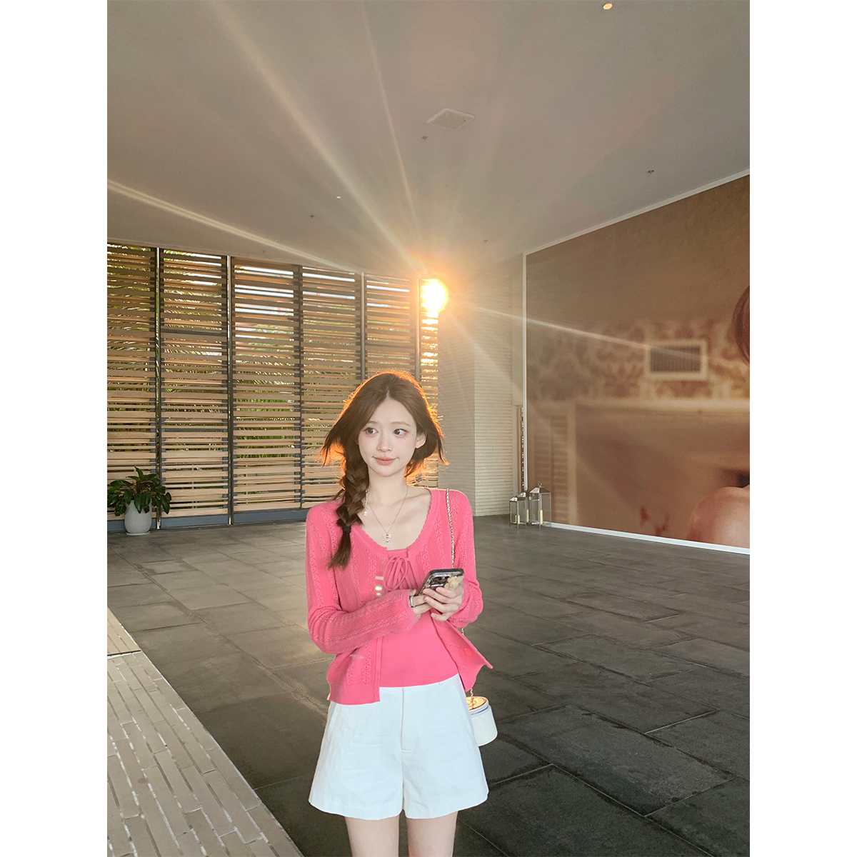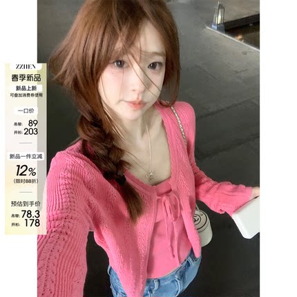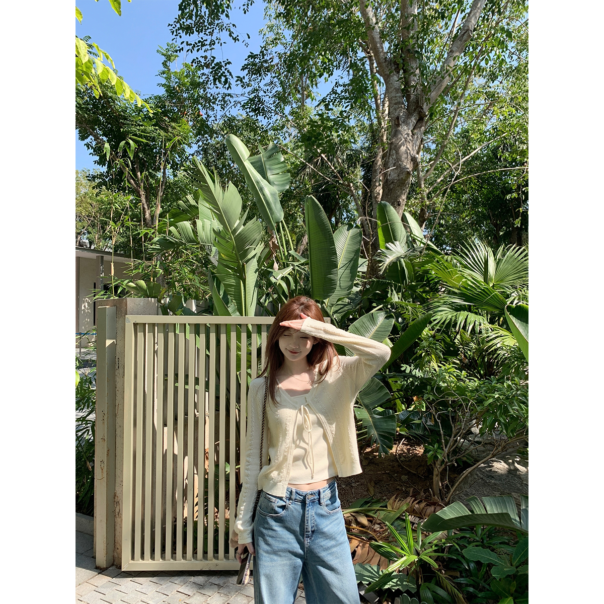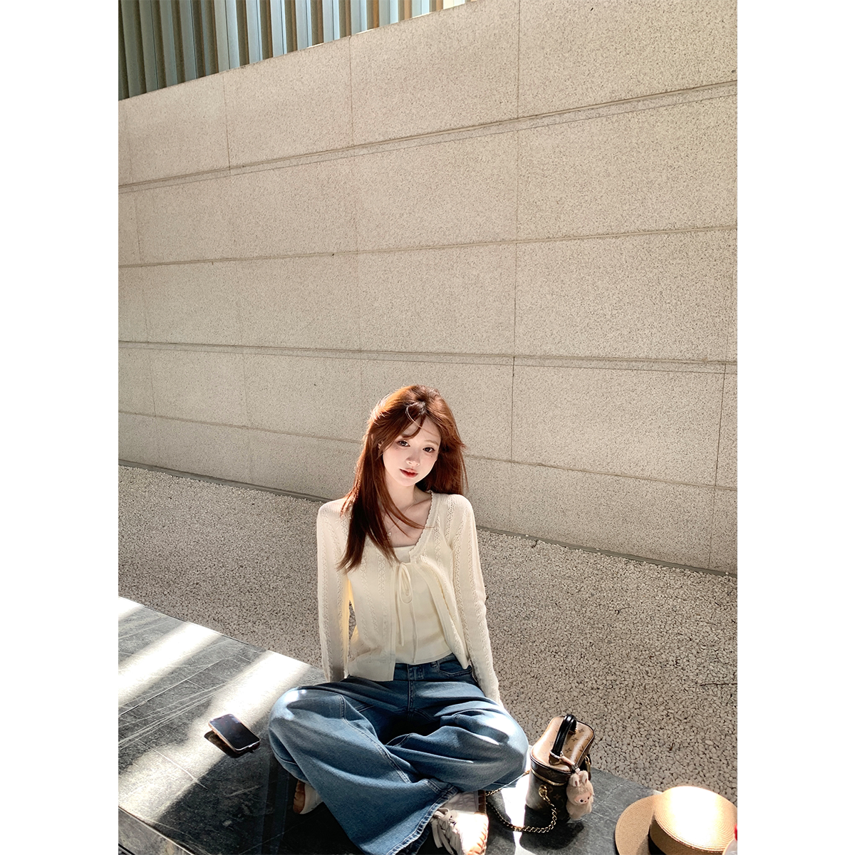 Zzhen 淡人小娇兰钩花镂空设计针织开衫&吊带两件套春季新款套装
