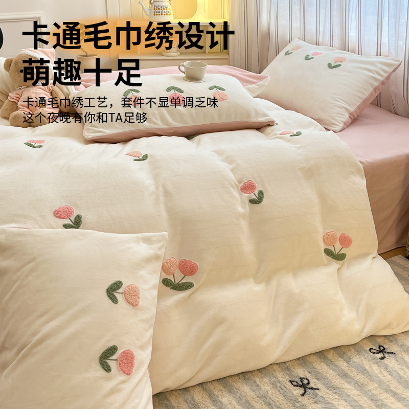 无印良品四件套牛奶绒床品2025新款儿童卡通毛巾绣学生床上三件套