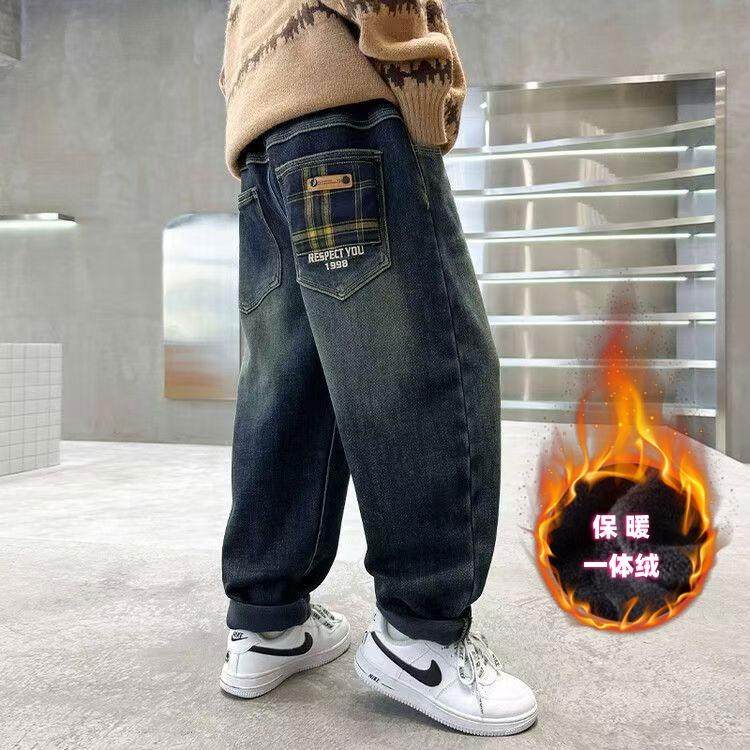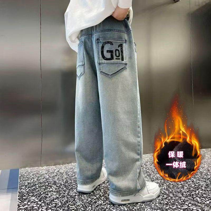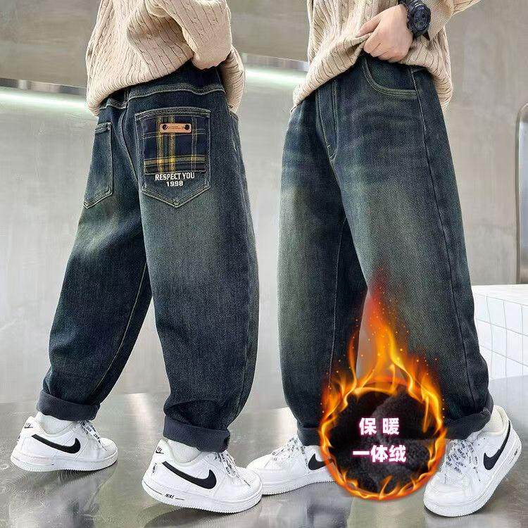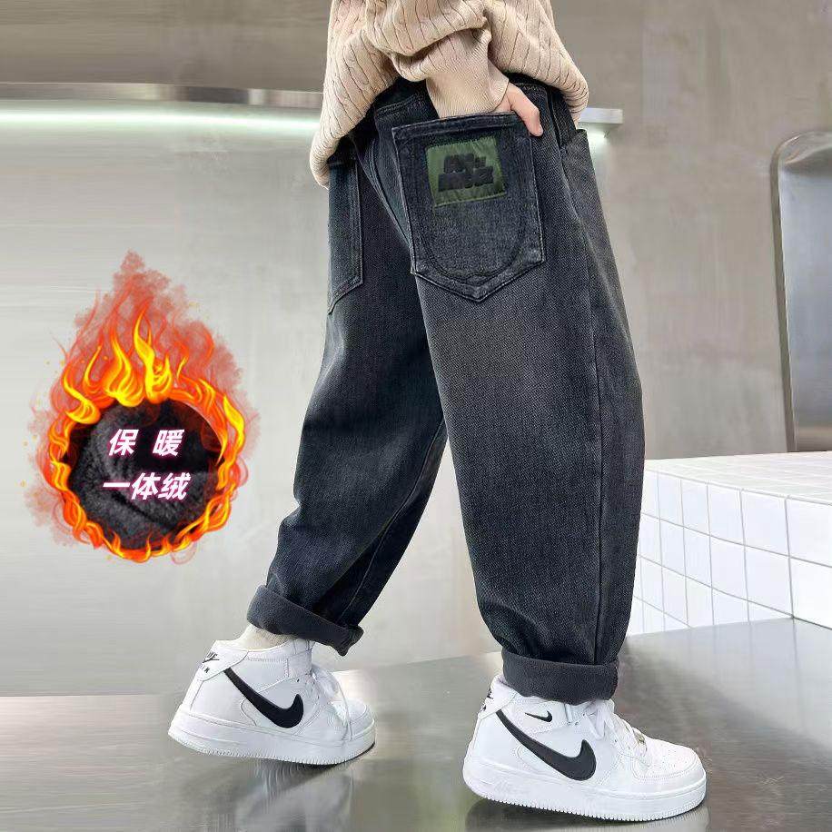 男童加绒牛仔裤秋冬款2025新款儿童加厚裤子一体绒中大童长裤帅气