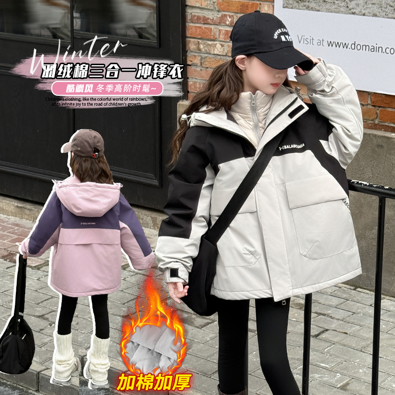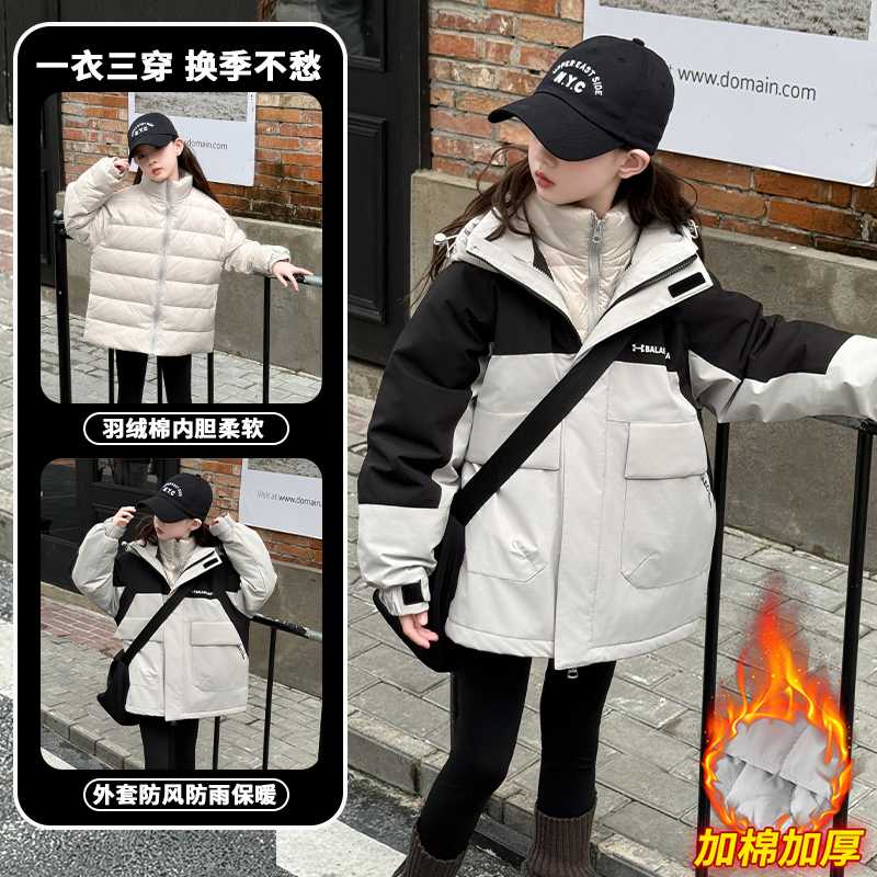女童冲锋衣三合一可拆卸2025新款秋冬洋气中大童夹棉加厚棉衣外套