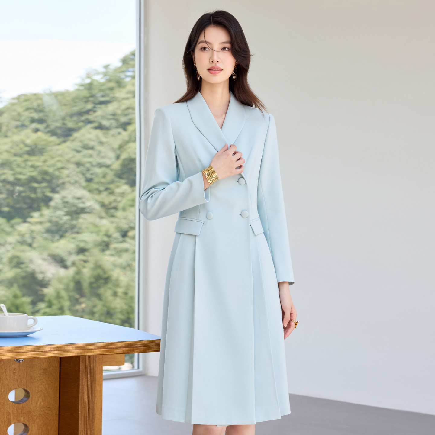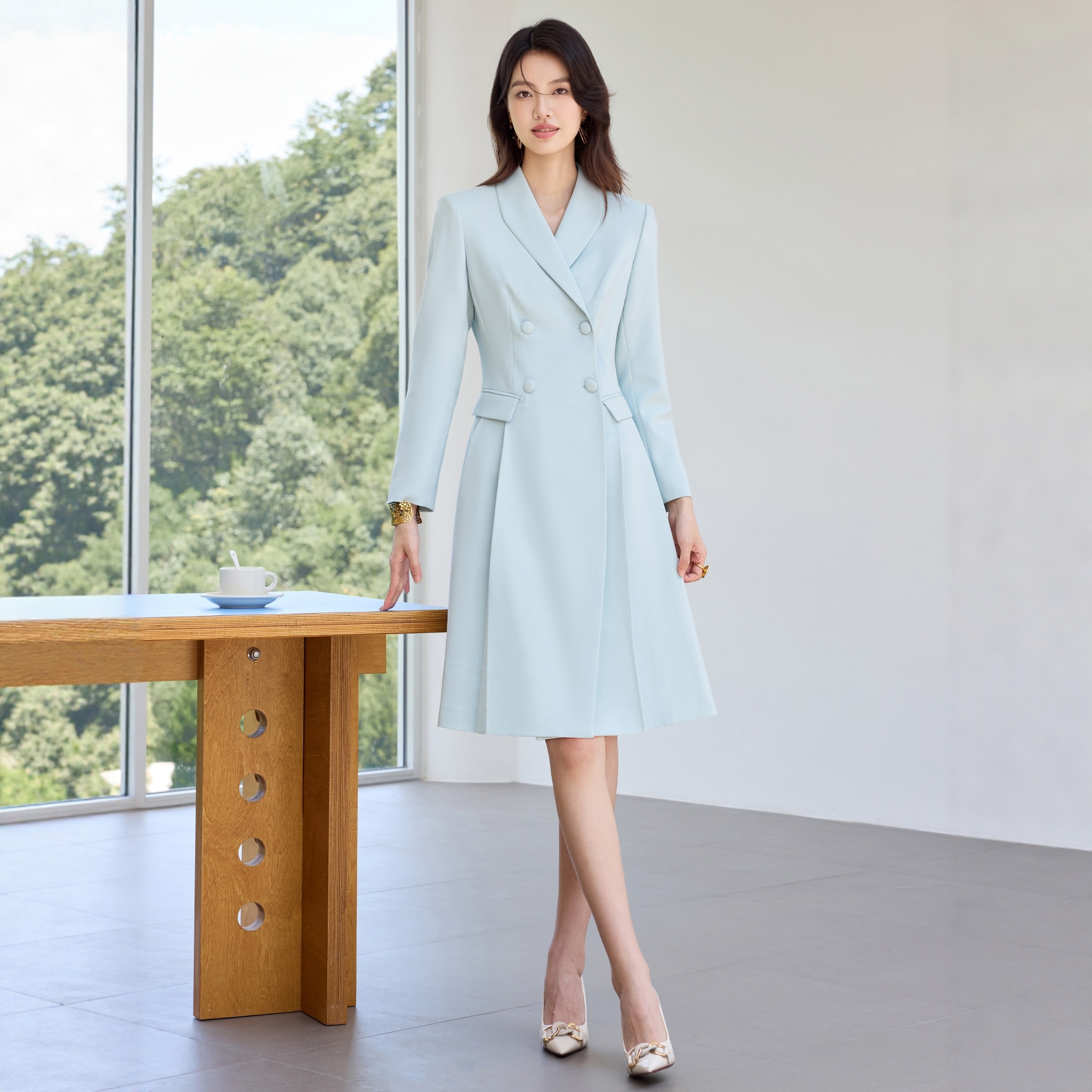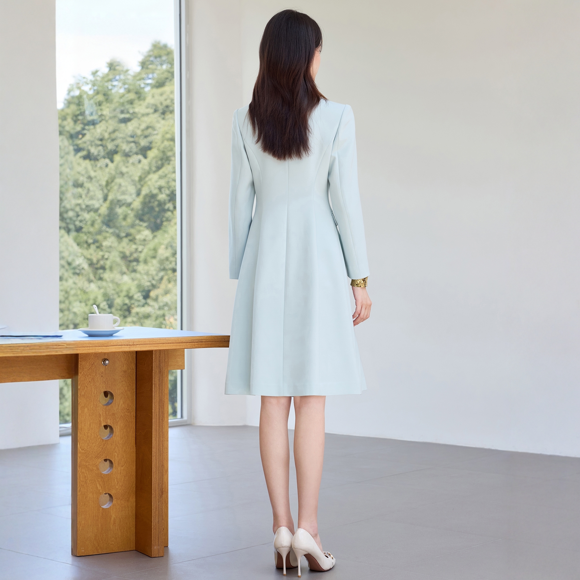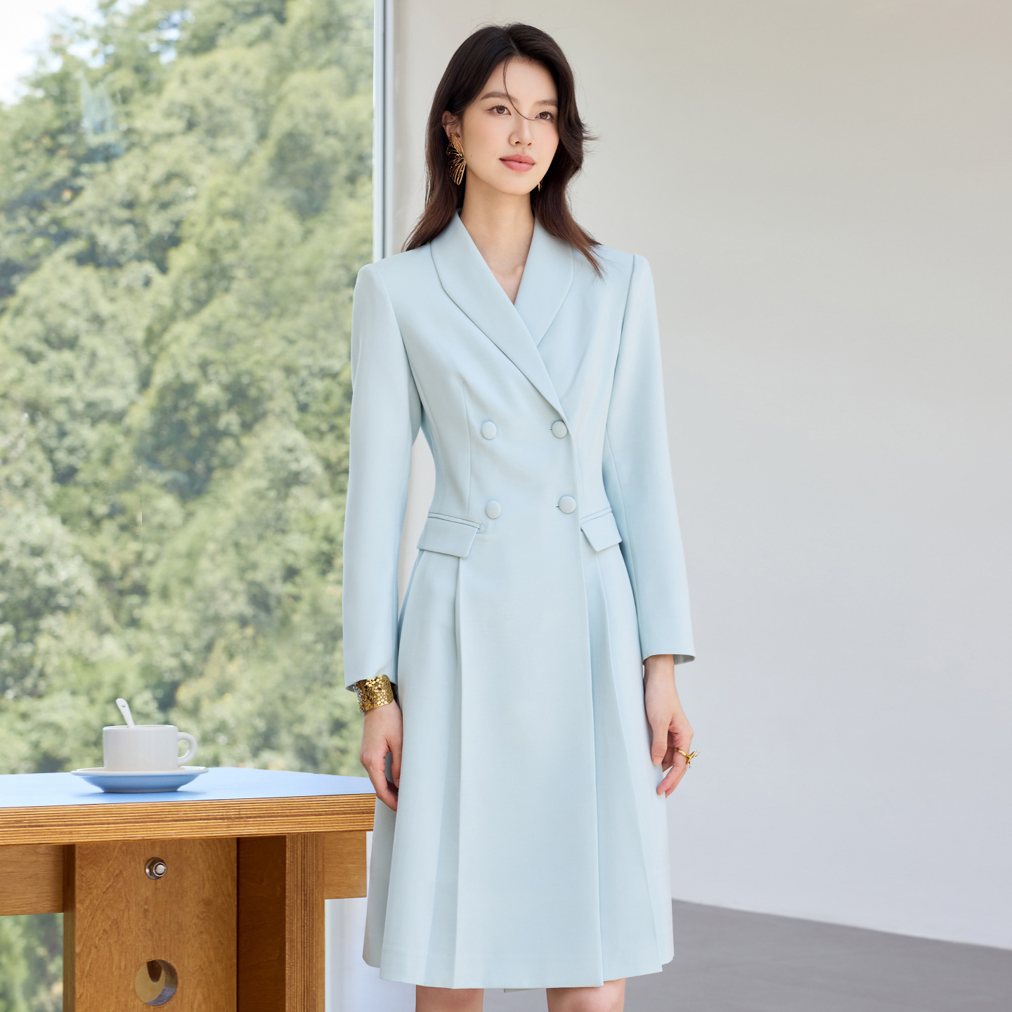 浅蓝色主持人2025新款高级感连衣裙美容院讲师时尚气质长袖职业装