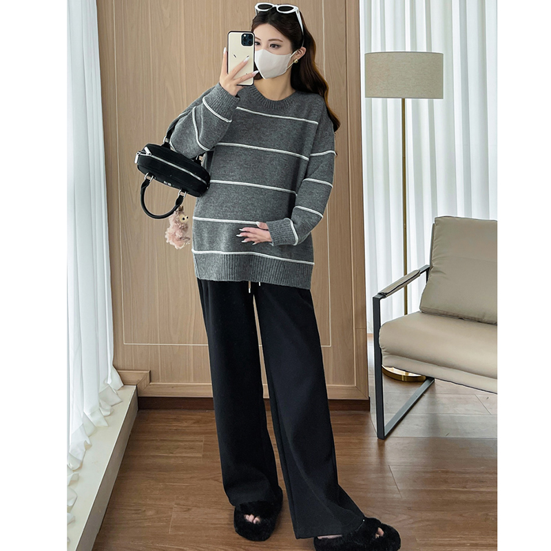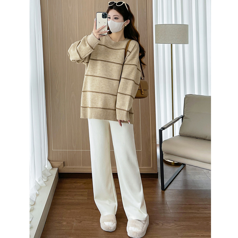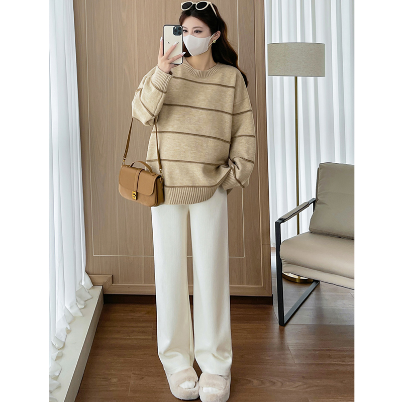 孕妇套装秋冬孕妈2025新款韩版休闲条纹针织遮肚毛衣裤子两件套女