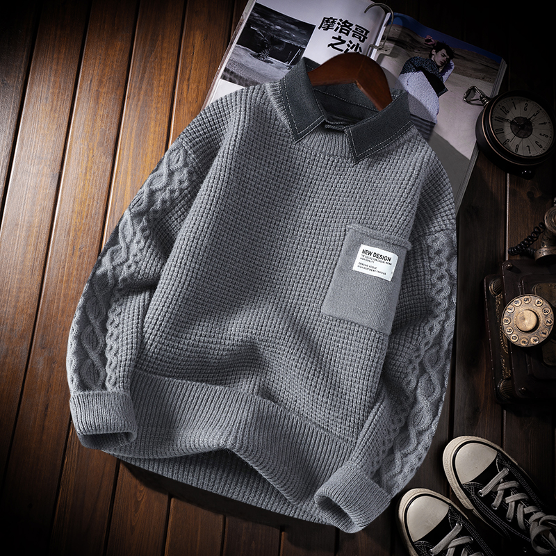 衬衫领假两件毛衣男士秋冬款粗毛线纯色打底衫保暖冬季男士针织衫