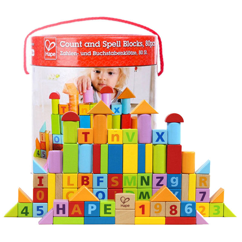 hape木质拼搭积木形状颜色字母数字认知启蒙80粒早教桶儿童玩具