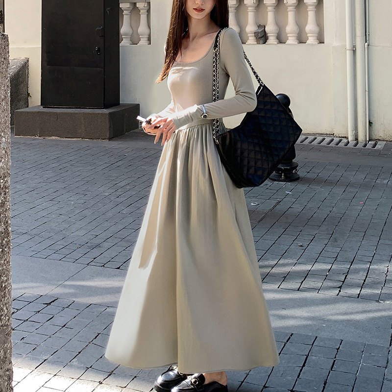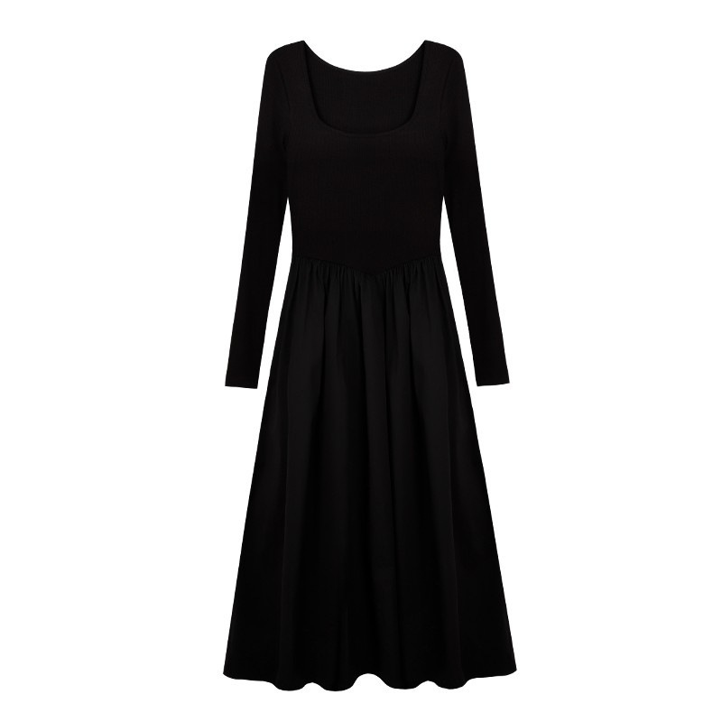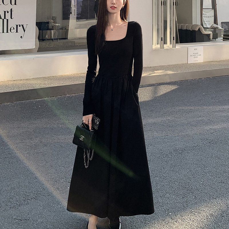 法式方领连衣裙女春秋季新款气质收腰显瘦长袖黑色A字长款裙子