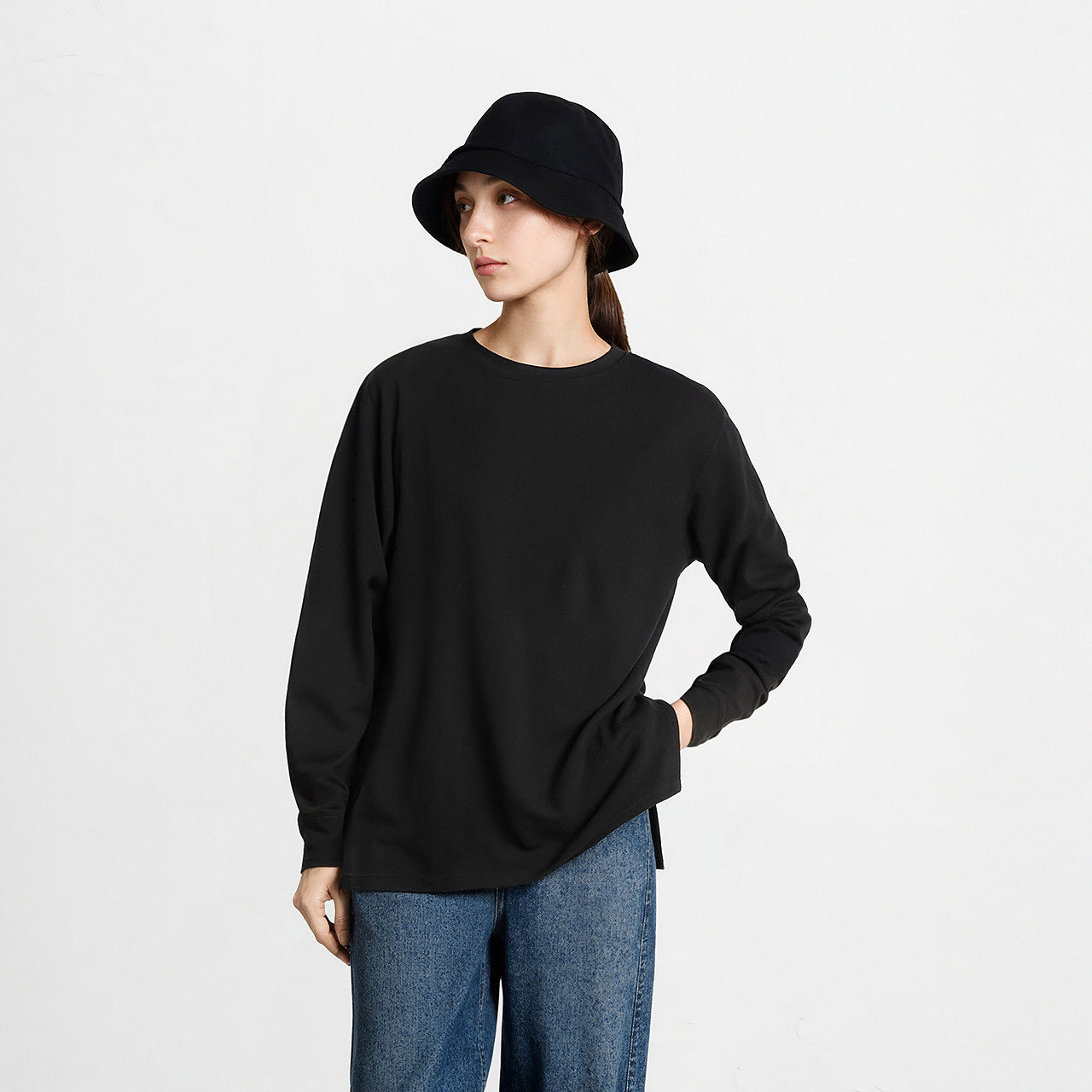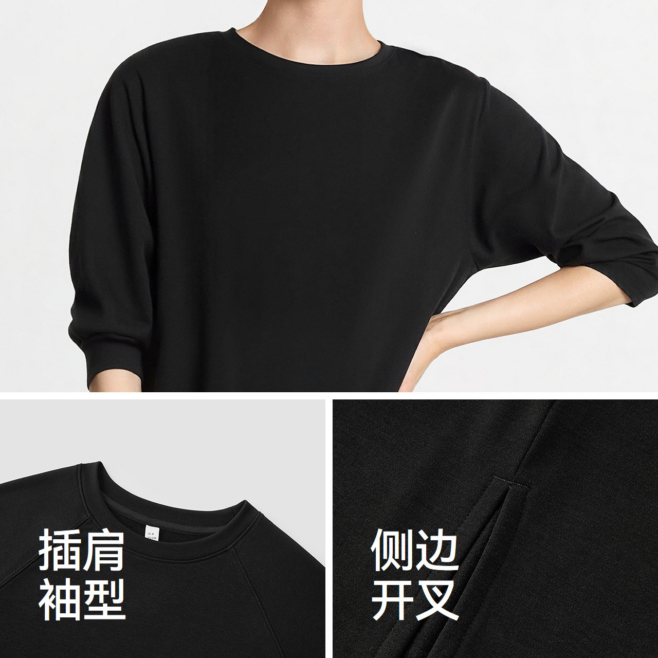 森马长袖T恤女中长款宽松发热纯色插肩袖2025冬新款抓毛开叉上衣
