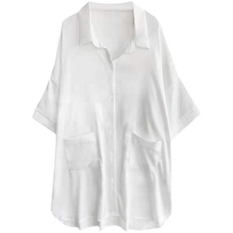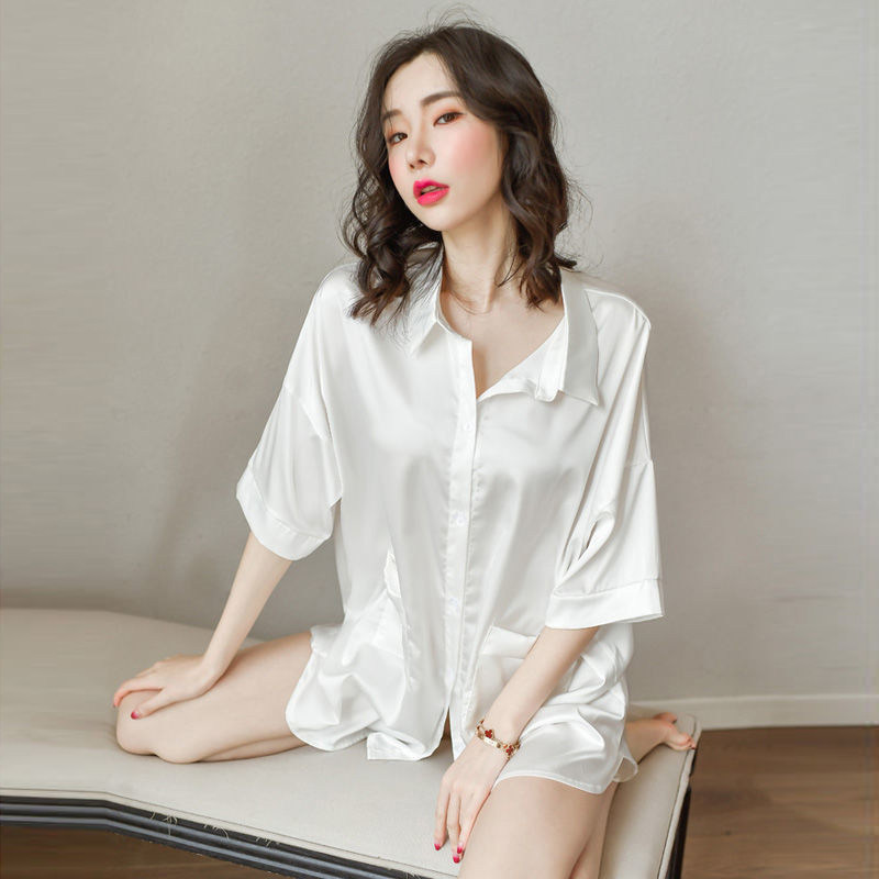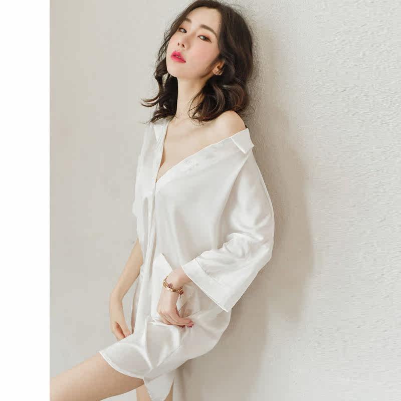 丝滑睡裙女春秋可外穿白衬衫冰丝长款短袖网红性感睡衣夏季男友风