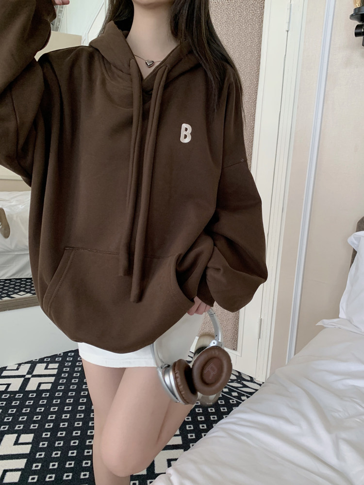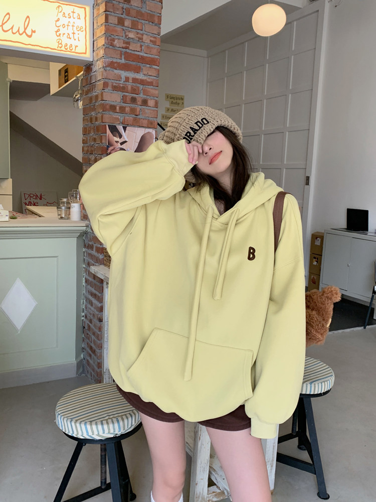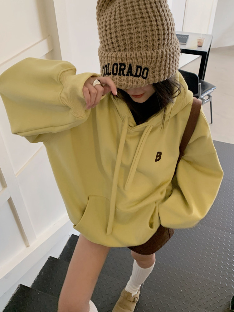 美式连帽加厚加绒卫衣女秋冬款慵懒风韩版宽松休闲套头黄色上衣