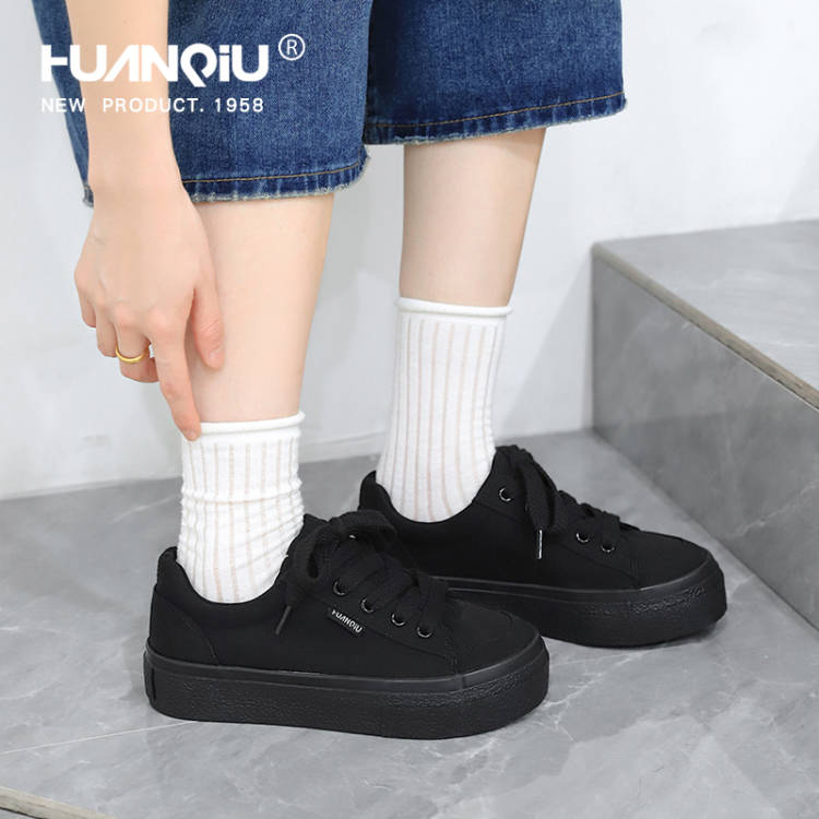 环球全黑色厚底帆布鞋女夏薄款软底不累脚低帮纯黑休闲板鞋小黑鞋