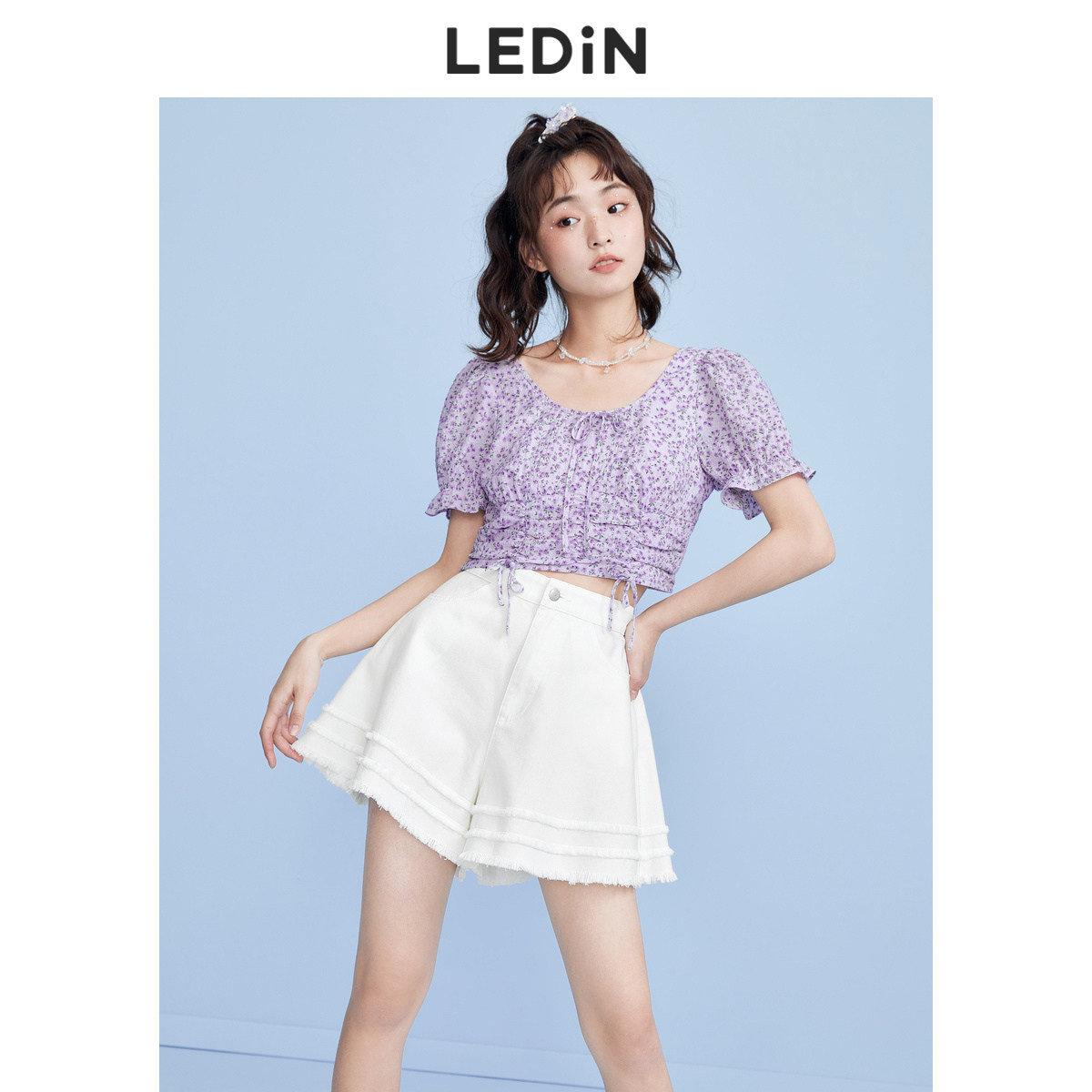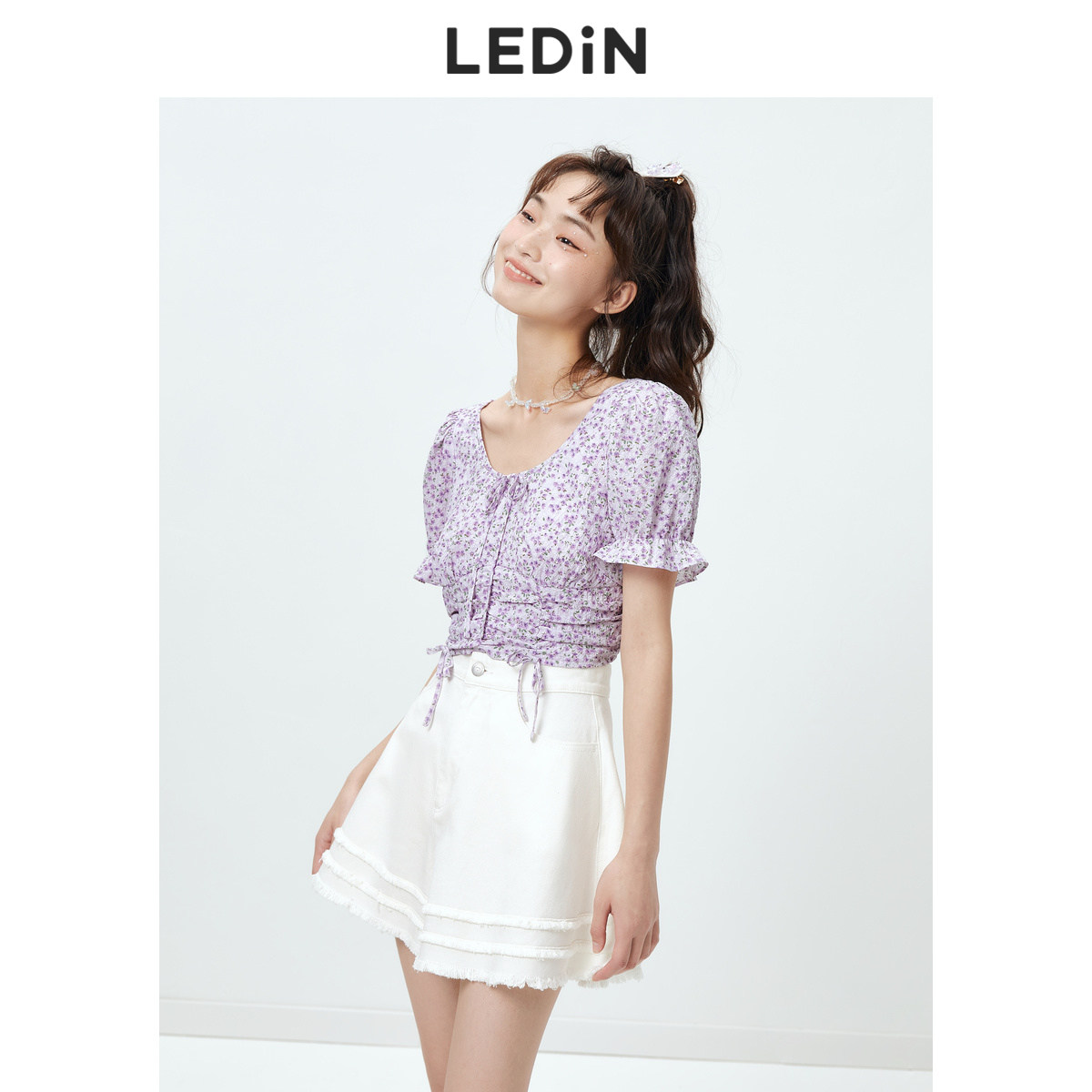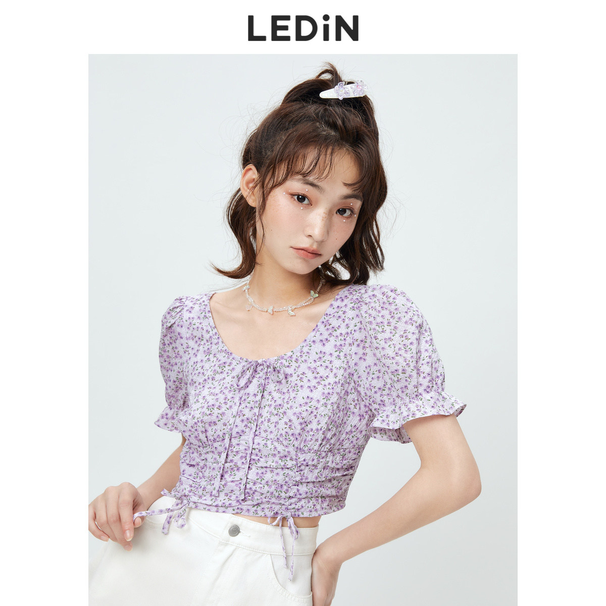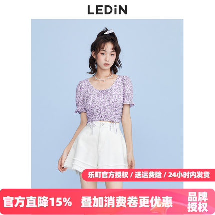 【清仓】乐町抽褶碎花短上衣休闲秋季新款紫色雪纺衫女宽松