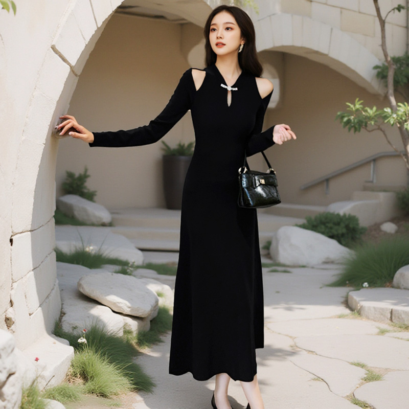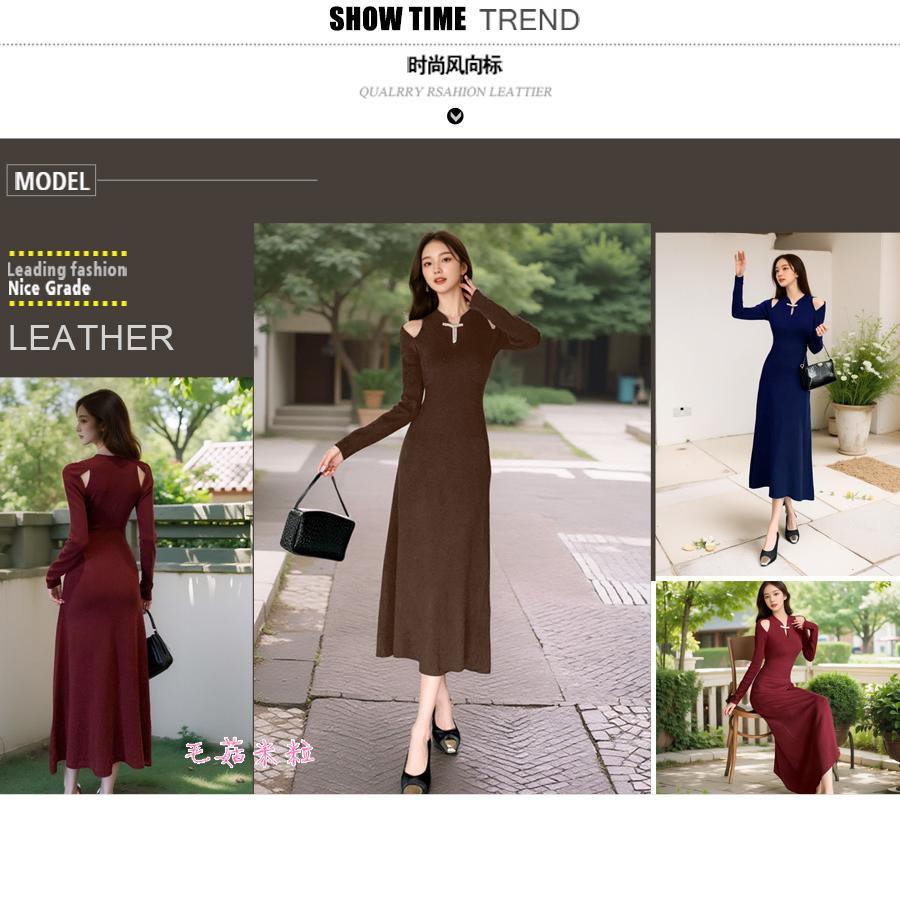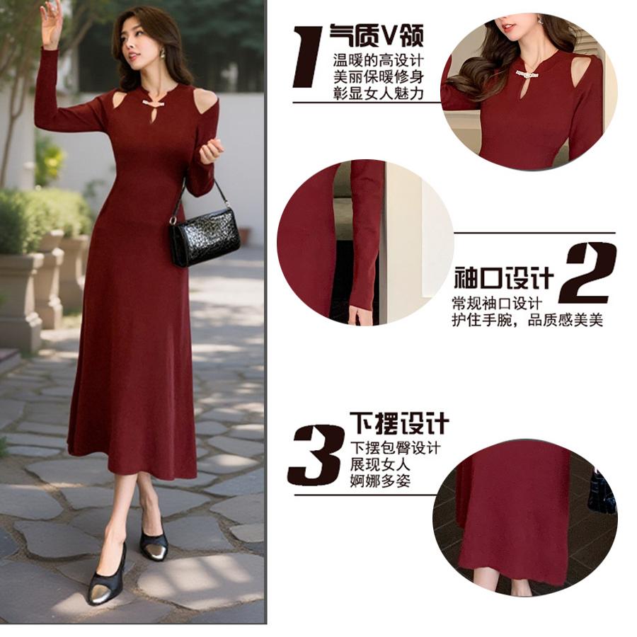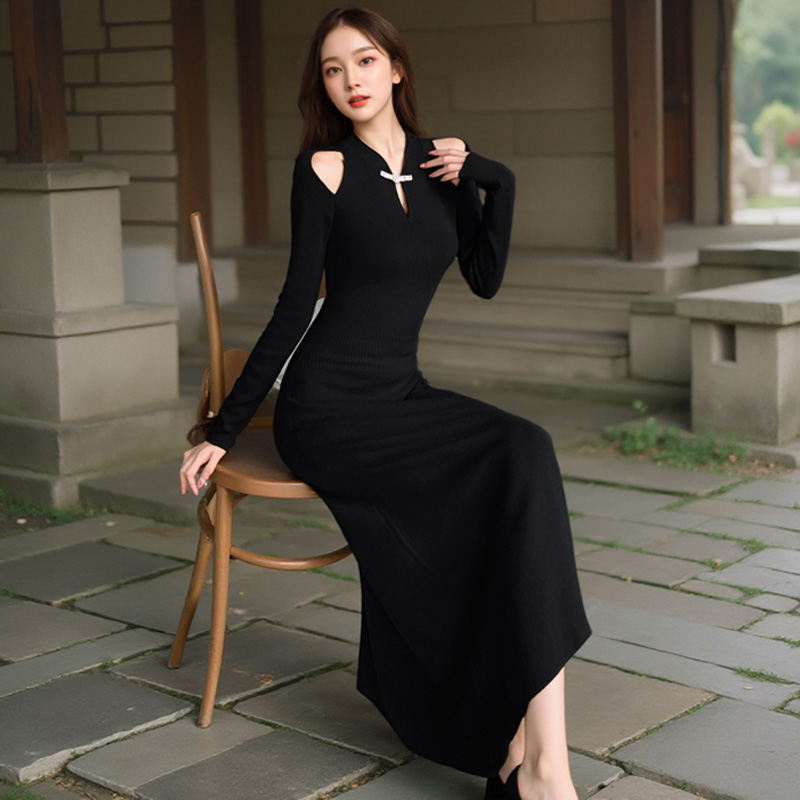 新中式改良旗袍长款针织连衣裙女秋冬法式复古假两件镂空显瘦裙子