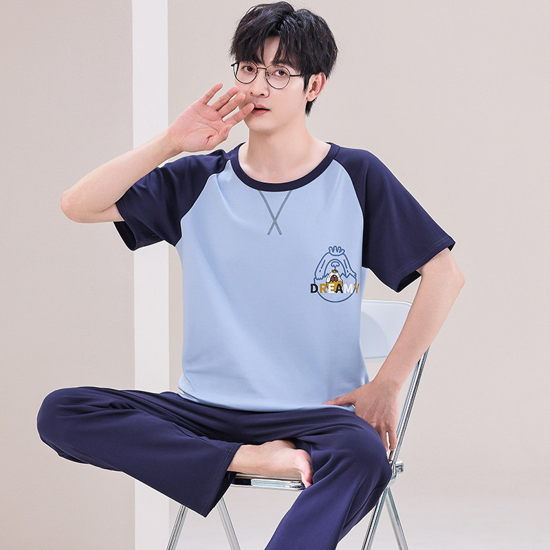 睡衣男士夏季休闲纯棉简约短袖长裤大码宽松青少年家居服外穿套装