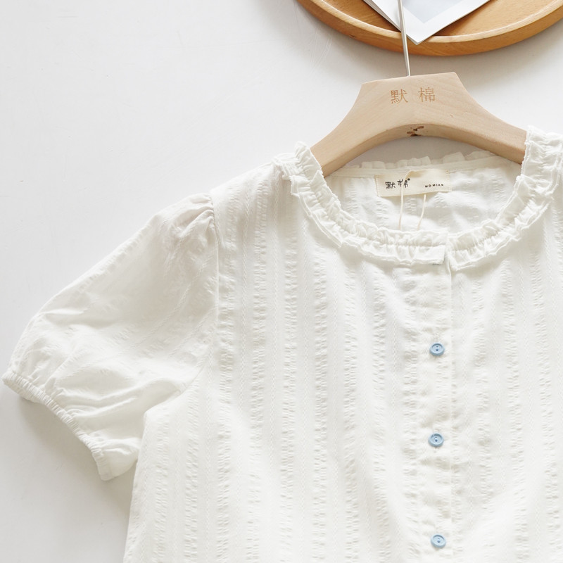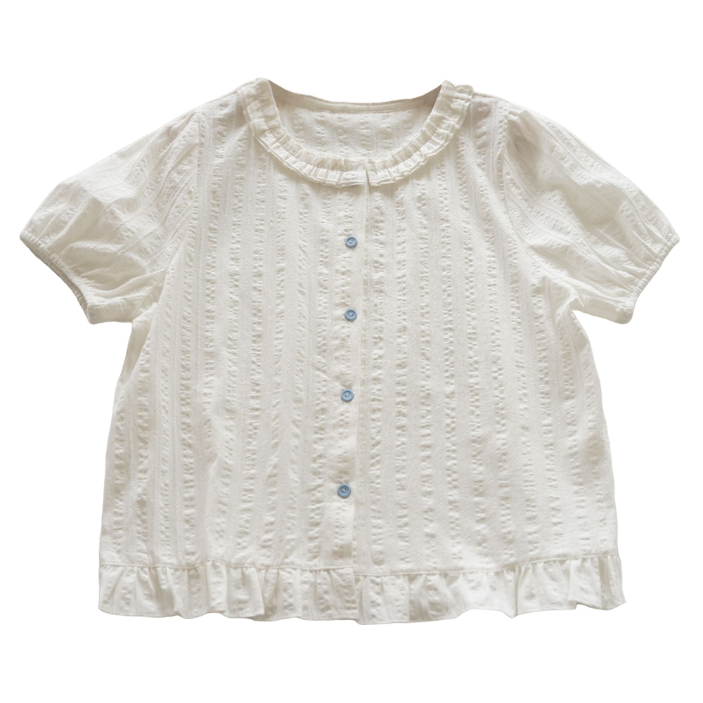 默棉 法式小众设计文艺蓝色泡泡棉条纹半裙女木耳边娃娃衫/半裙