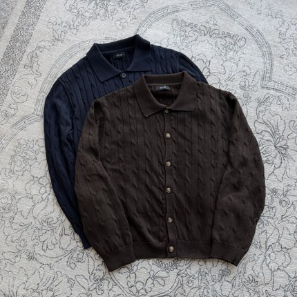 秋冬绞花Polo领开衫毛衣外套