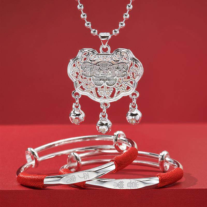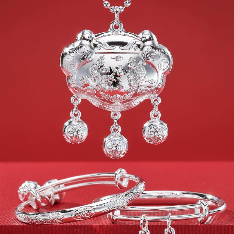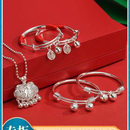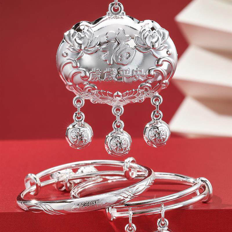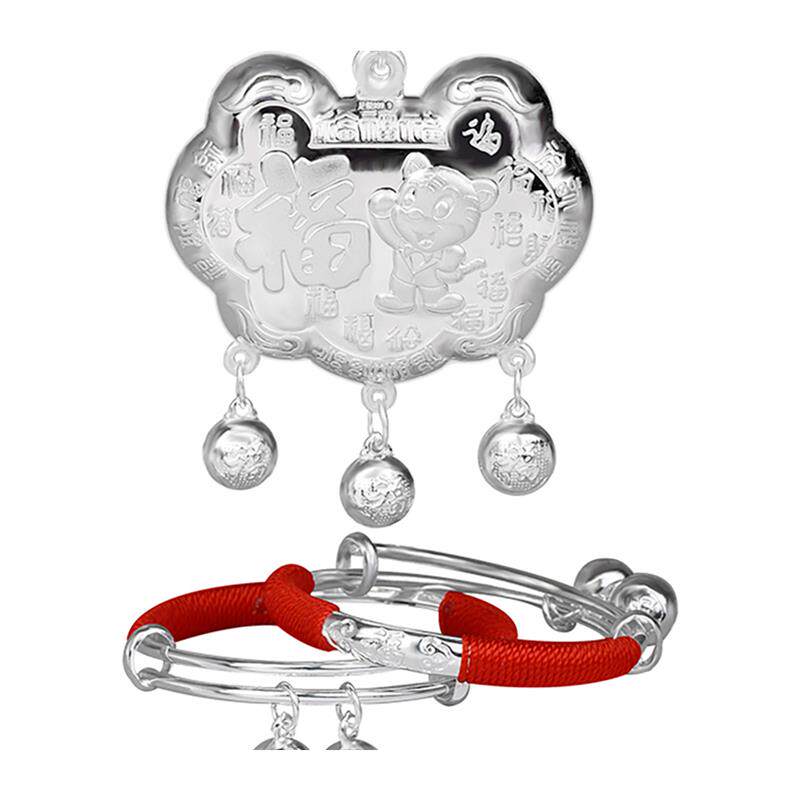 婴儿童宝宝银手镯子足银9999龙兔纯银长命平安锁满月周岁百天礼物