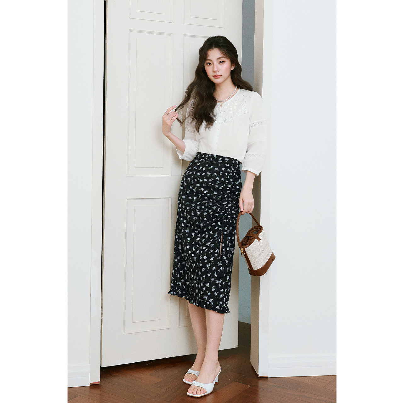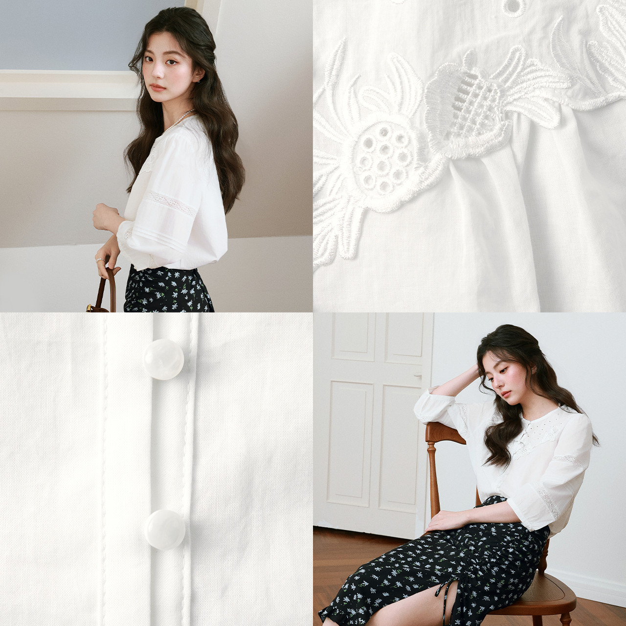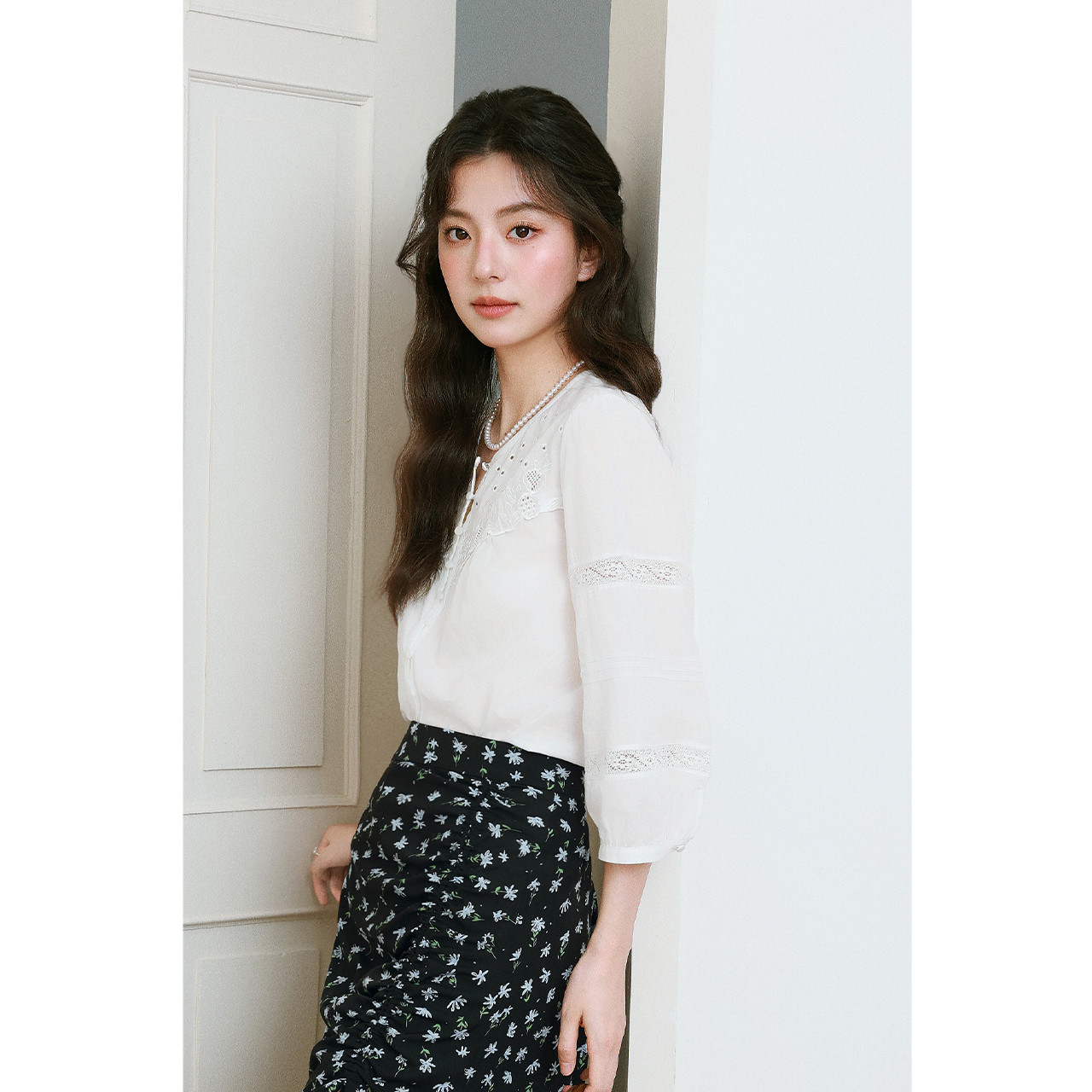 诗凡黎镂空蕾丝雪纺衫灯笼袖圆领衬衫25春夏纯棉法式衬衣上衣女