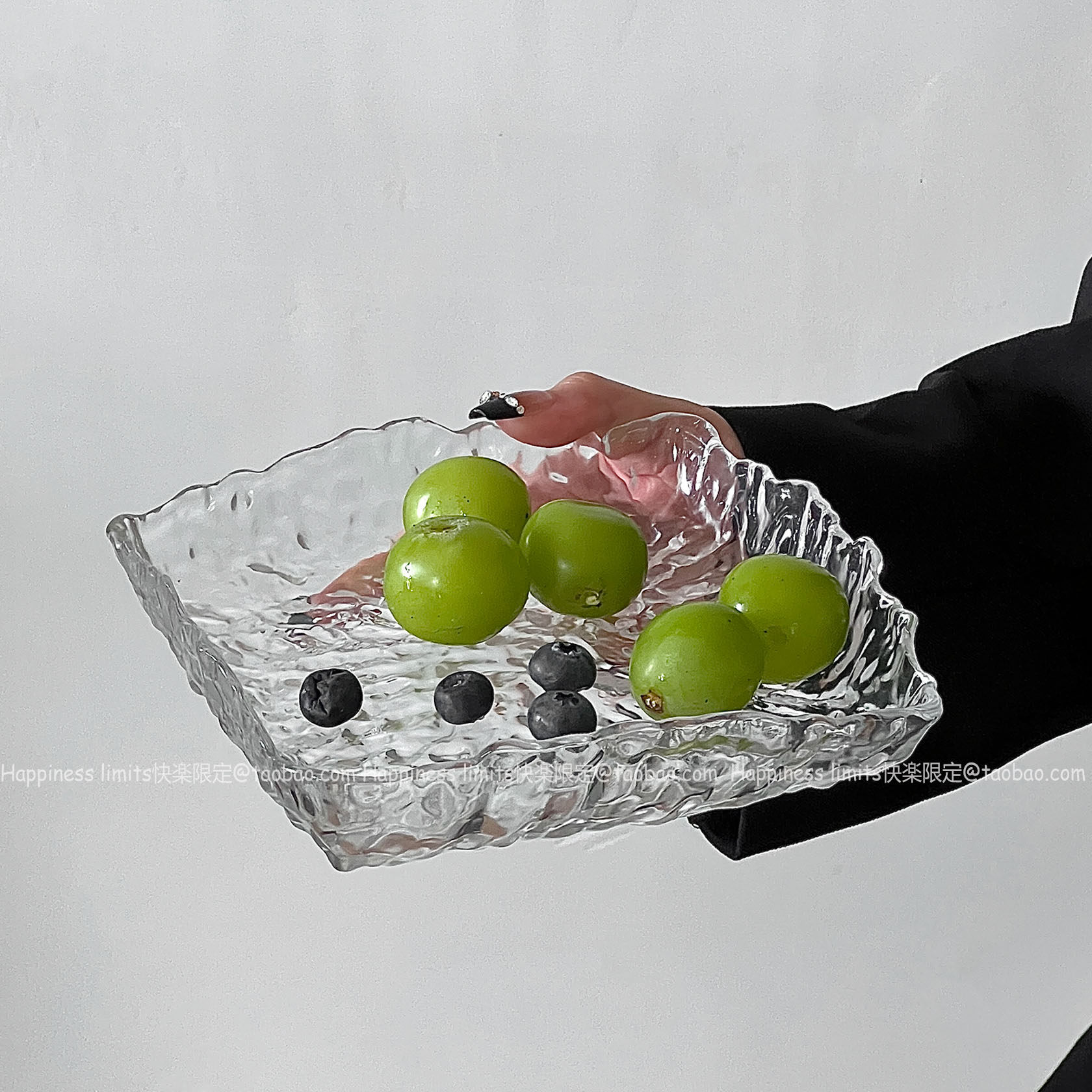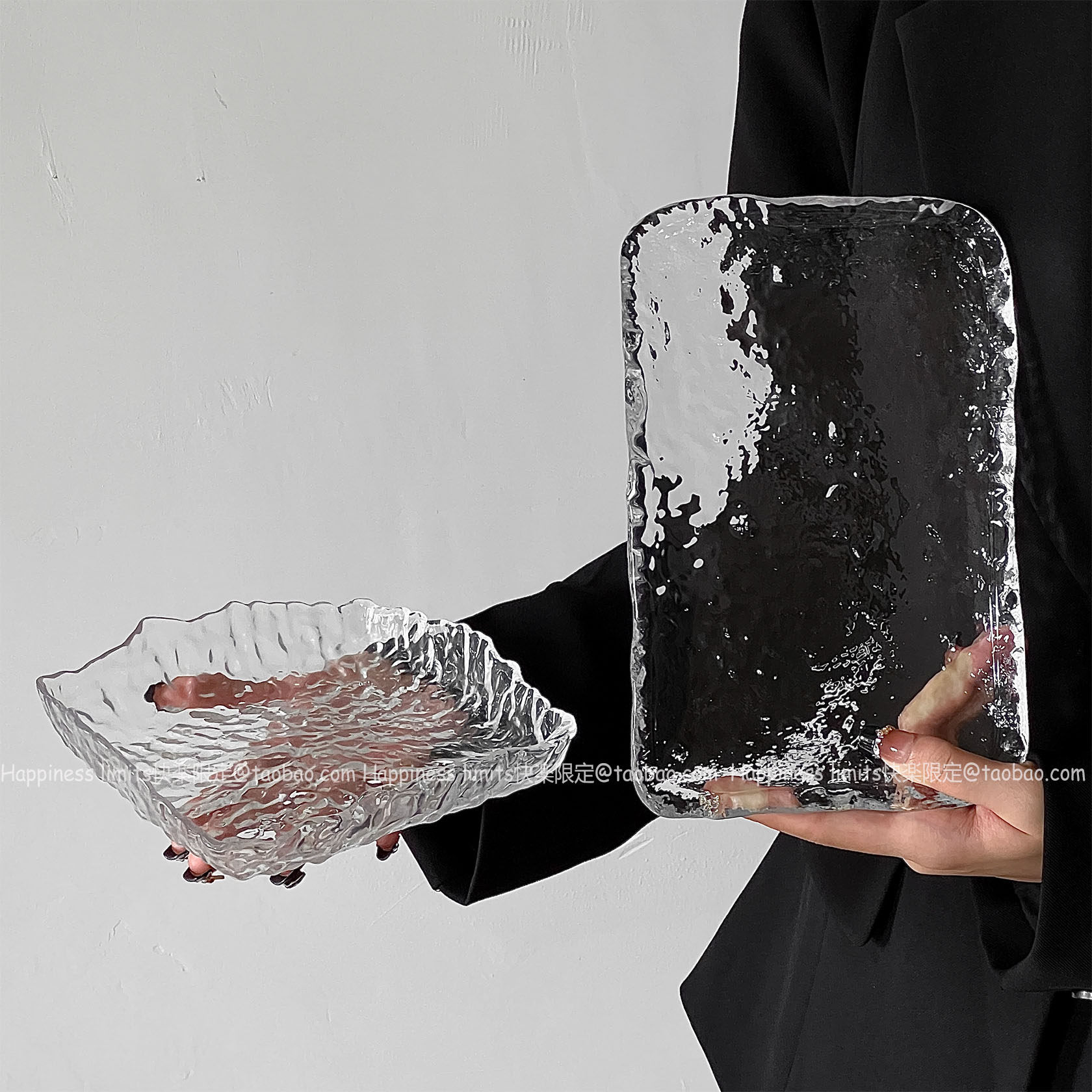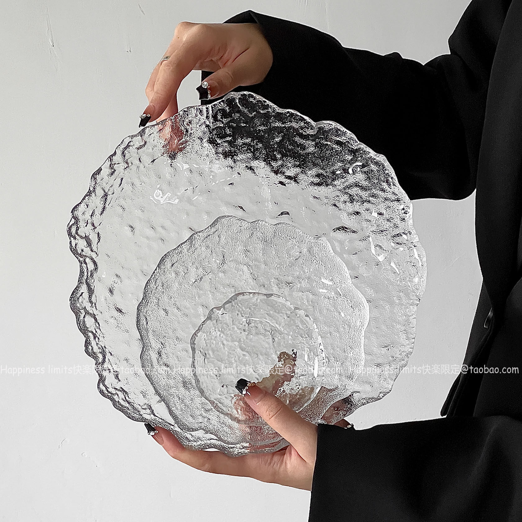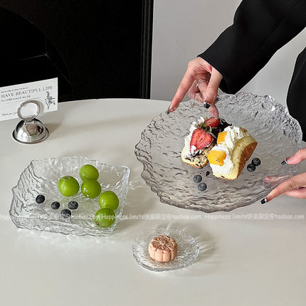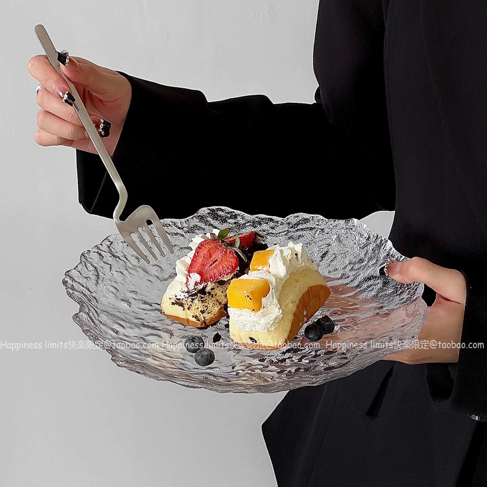 日式ins风不规则冰川玻璃盘子家用点心碟水果盘圆形甜品托盘餐具