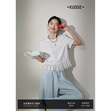 阔色蕾丝网纱花边拼接白色上衣女2025夏季新款正肩短袖宽松T恤