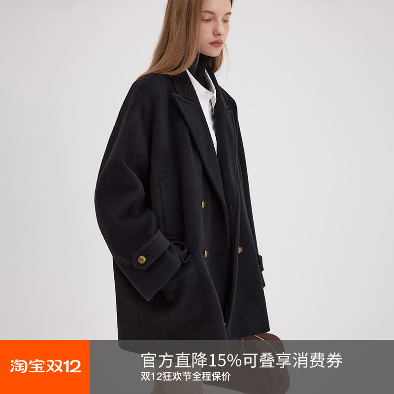 范洛Fano 2025冬季黑色短款赫本毛呢大衣女英伦风双排扣呢子外套