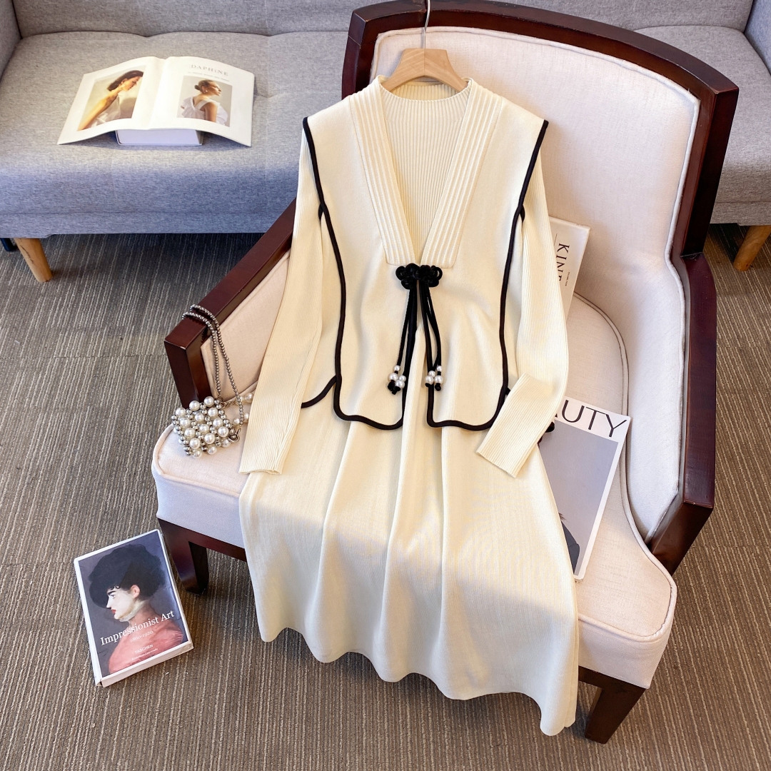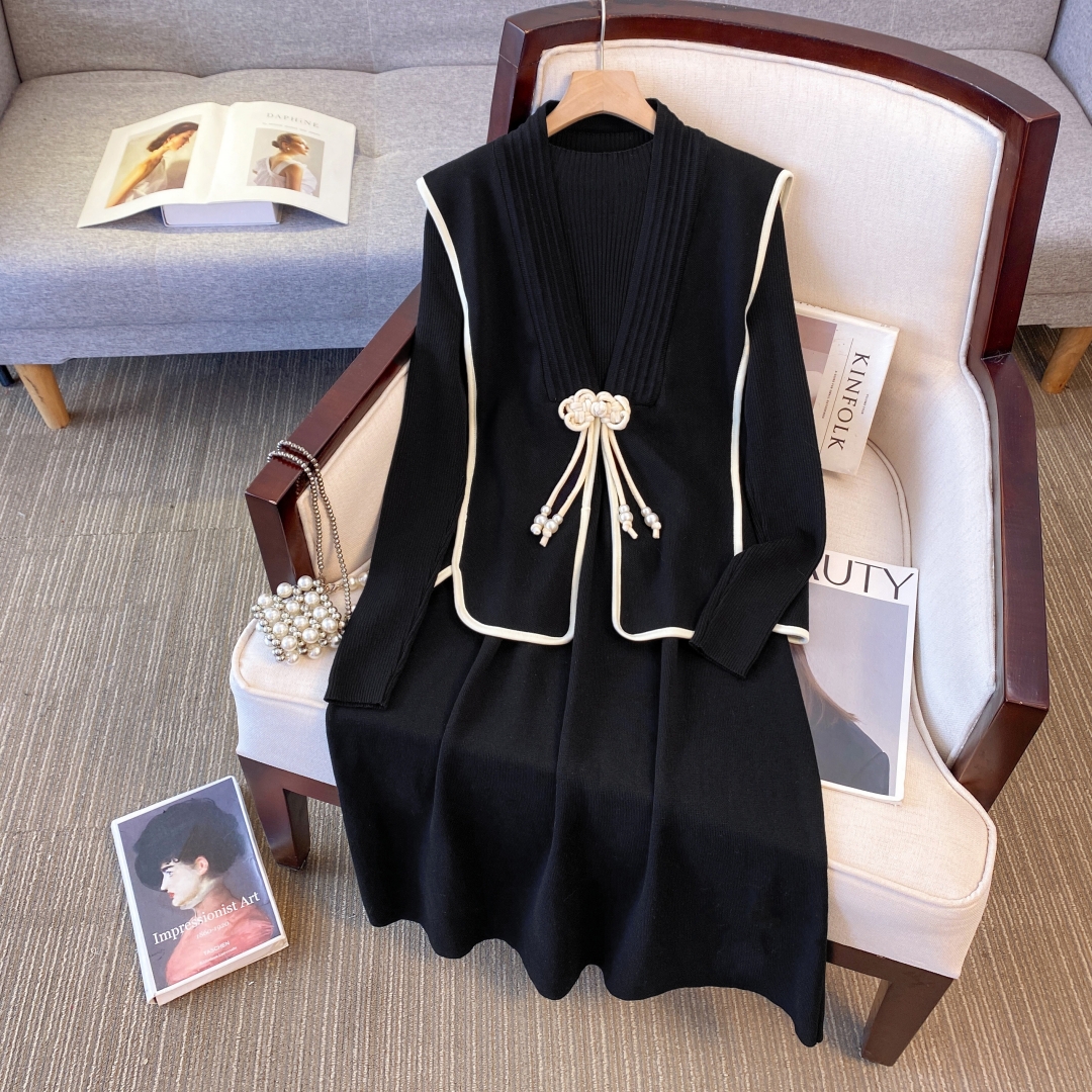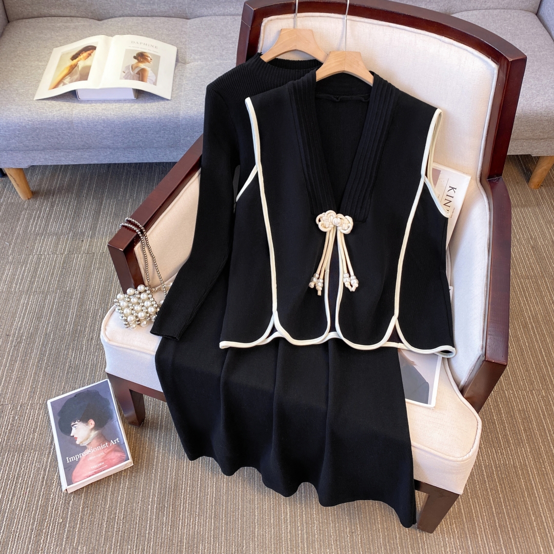档口秋六羊毛大码胖mm新中式国风盘扣针织马甲连衣裙两件套