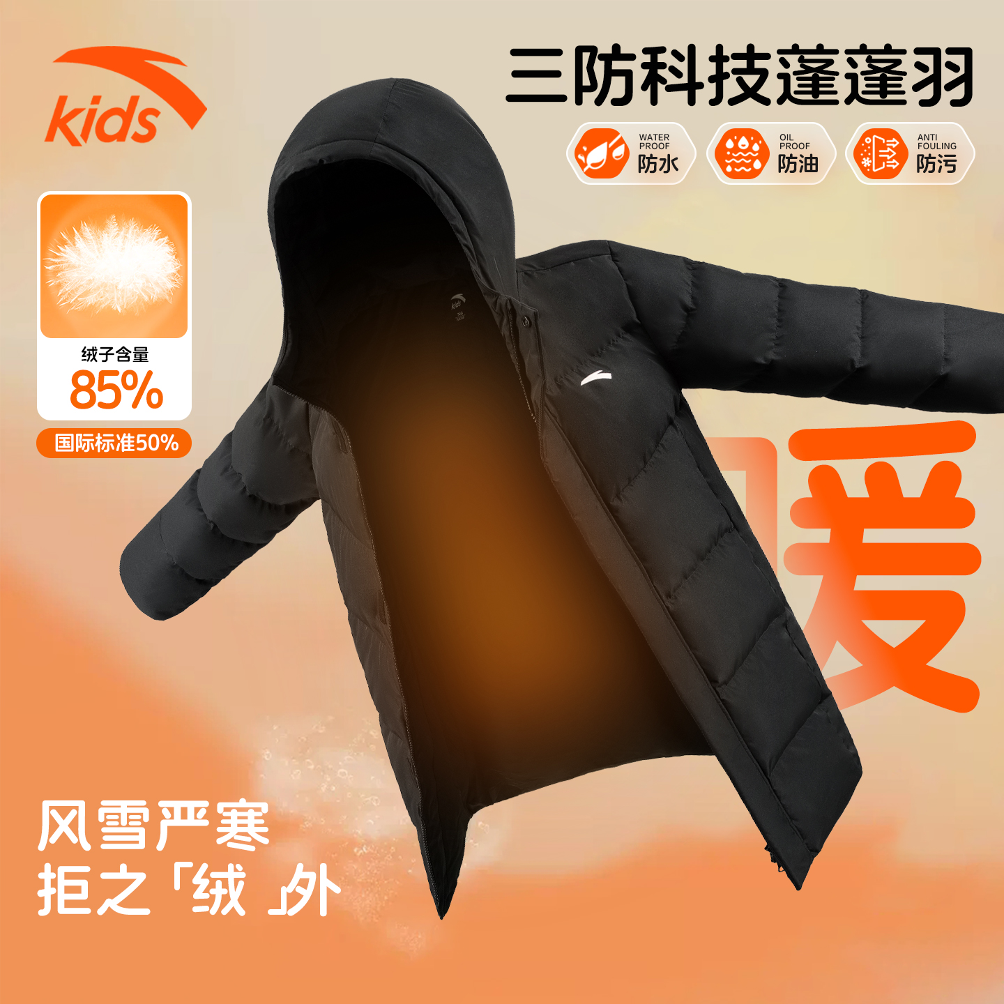 安踏儿童中长款羽绒服2025新款大童加厚保暖防风御寒防水连帽外套