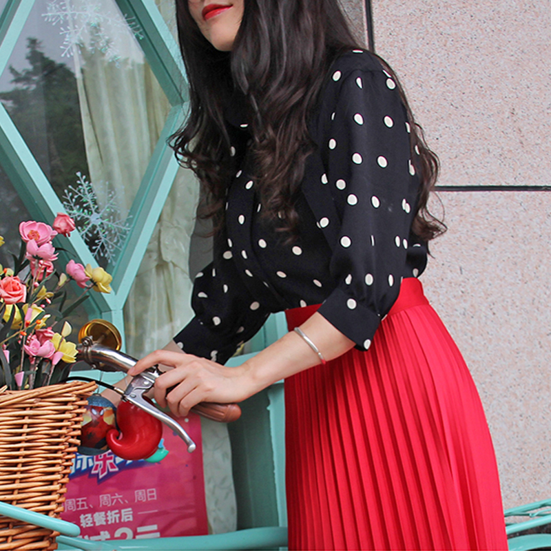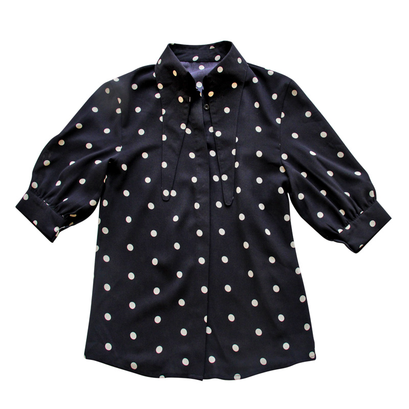 波点衬衫中袖大长尖领子潮款上衣韩国新款女装雪纺衫泡泡灯笼袖黑