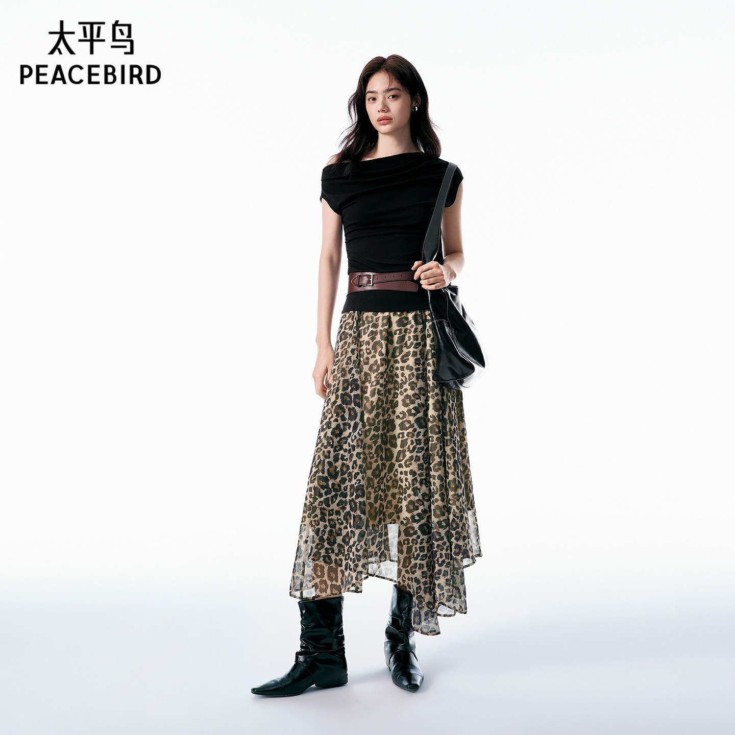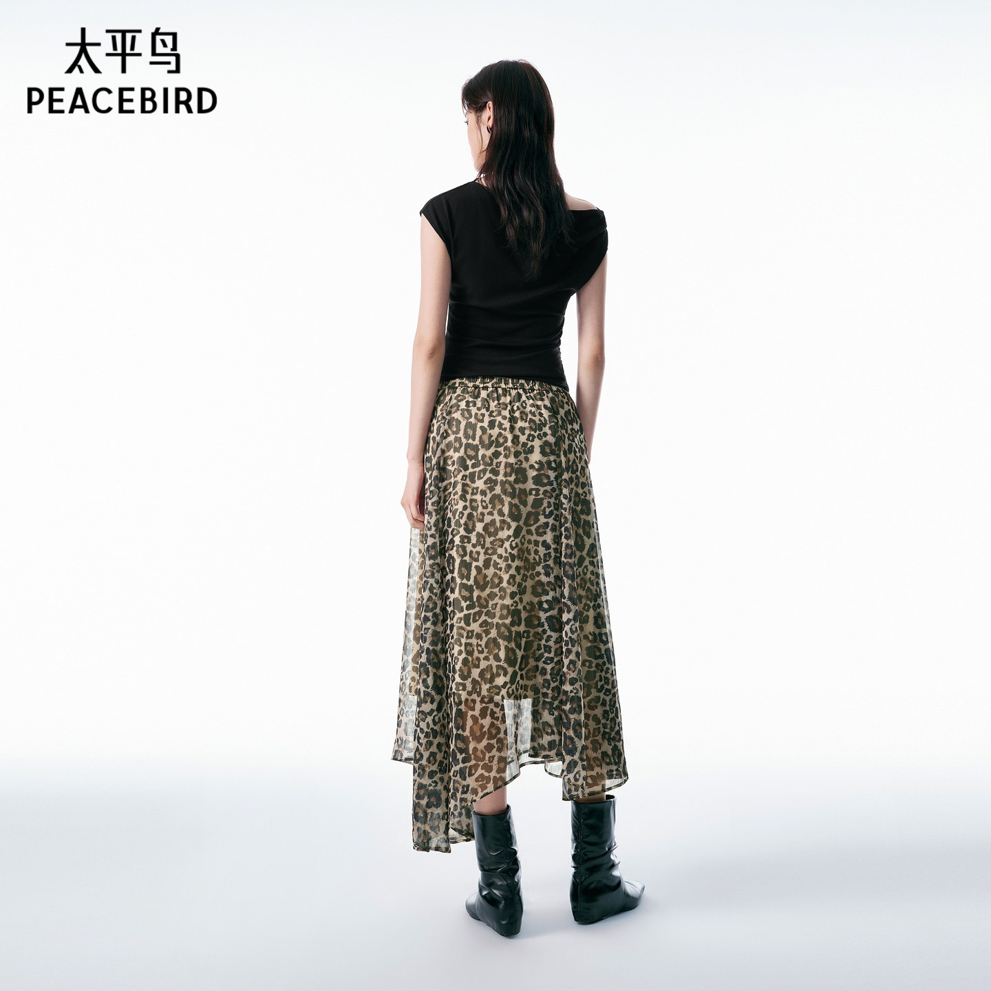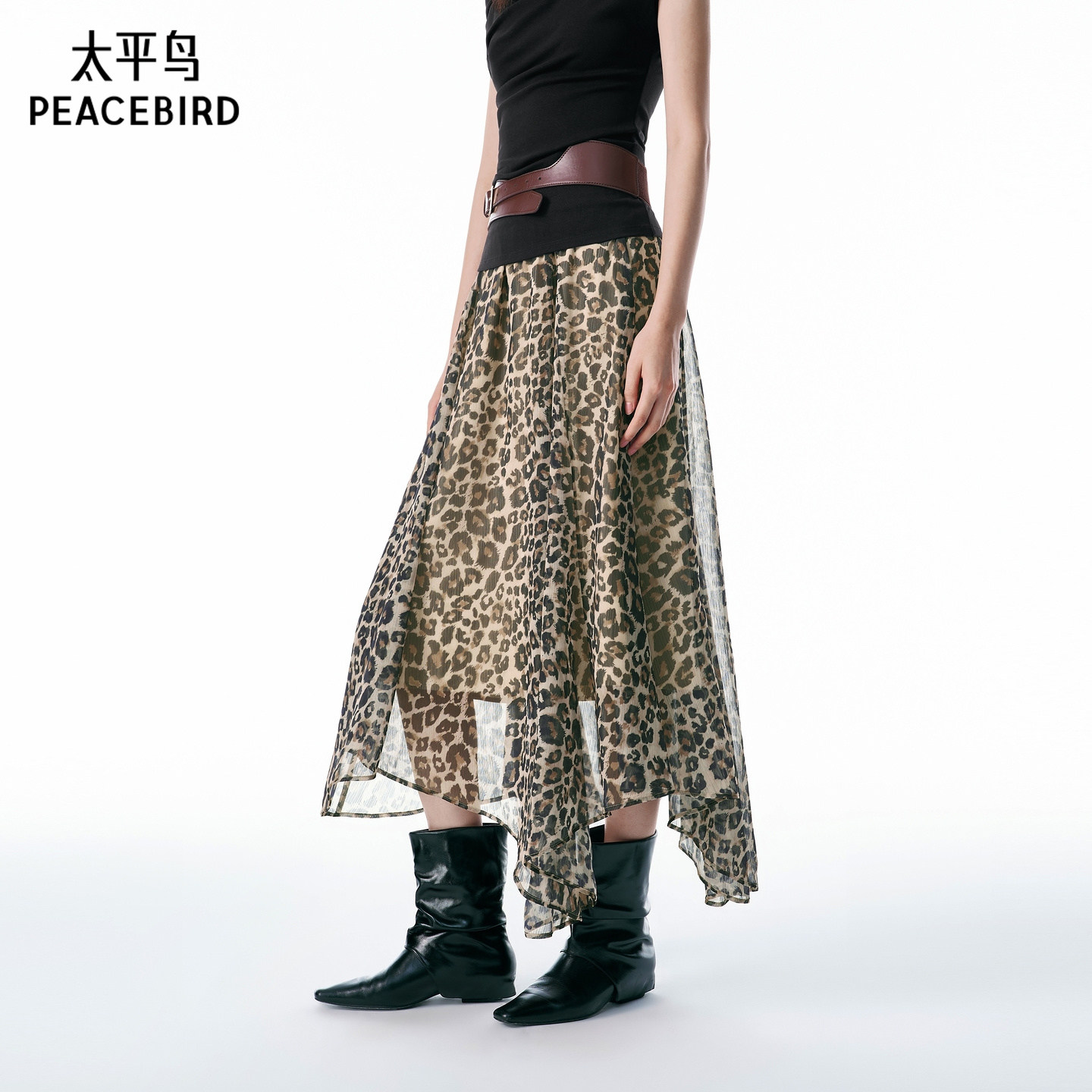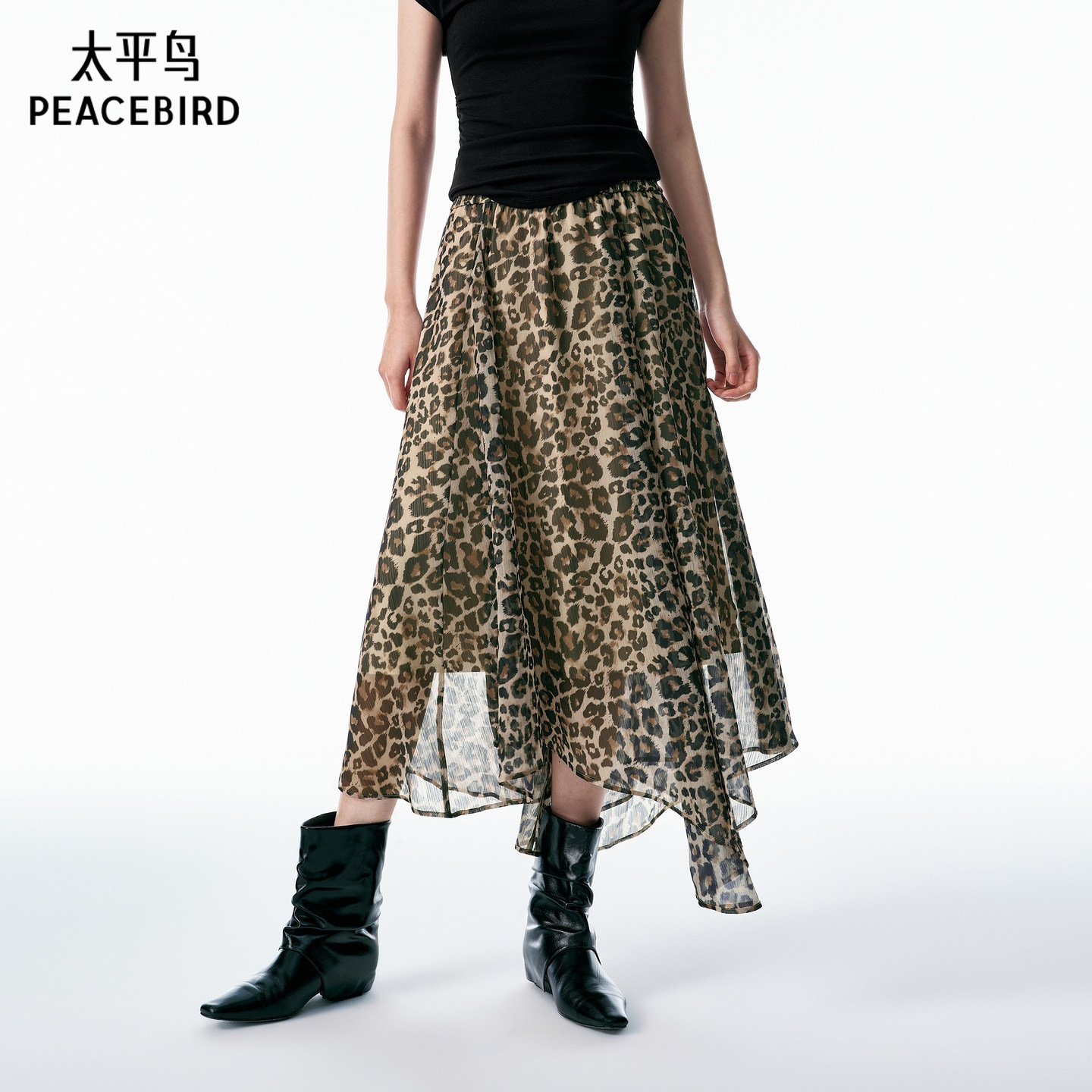 太平鸟豹纹飘逸不规则半身裙女时尚品质垂感面料伞裙女早春新款