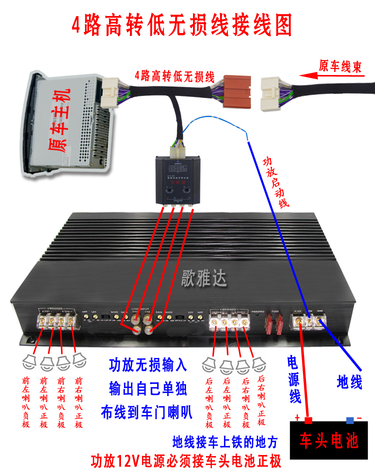 汽车4路功放无损高转低专车专用线束电源音频线有源转换器低音炮