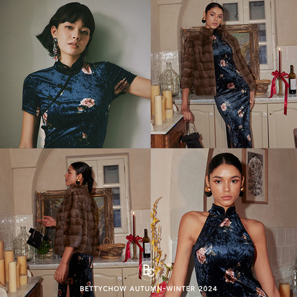 Bettychow 花朵真丝丝绒旗袍短袖无袖复古油画气质优雅修身连衣裙