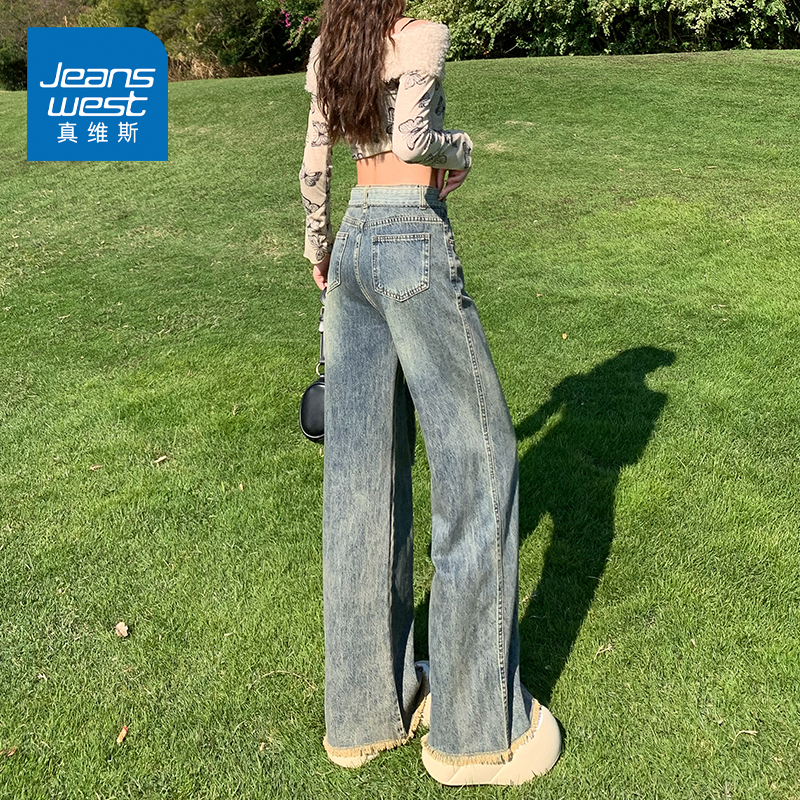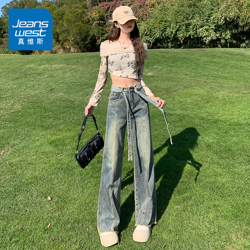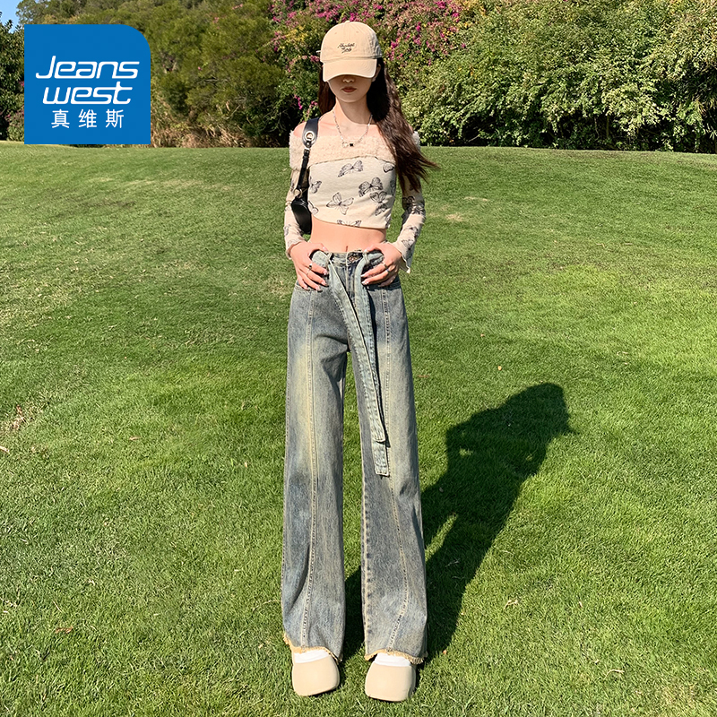 KZ真维斯春季飘带牛仔裤女宽松阔腿高腰直筒设计感春秋款裤子女士