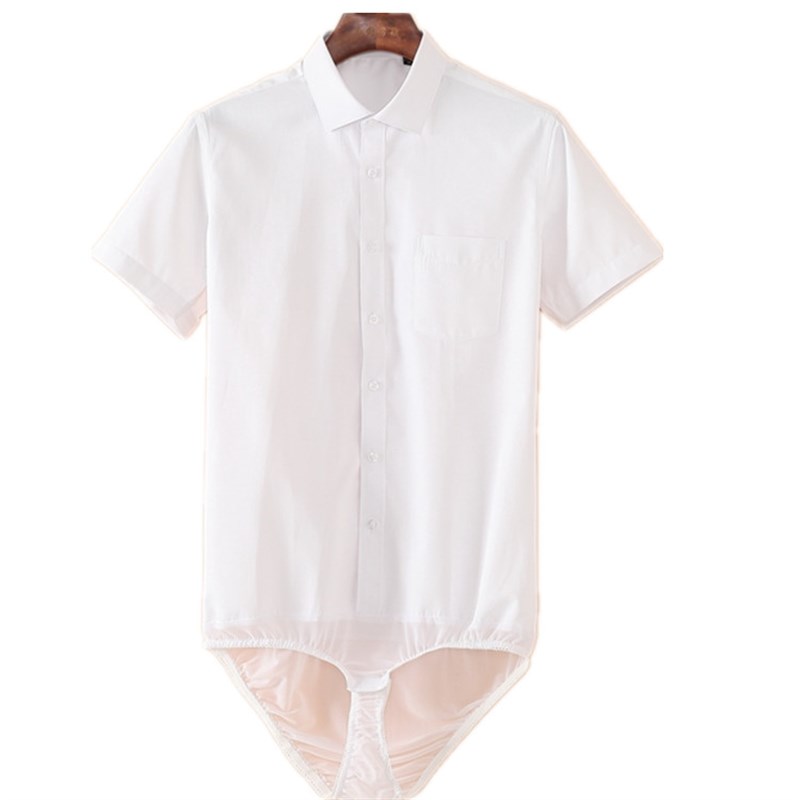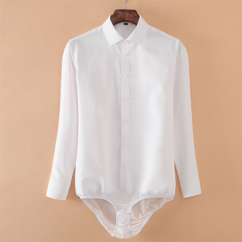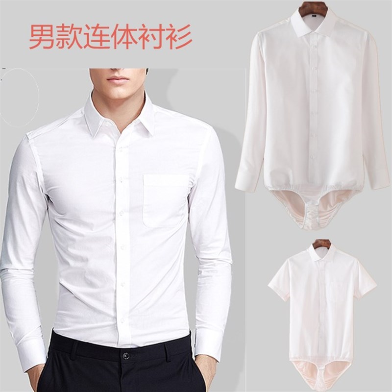 男士修身舞蹈连体衬衫白色 长袖 学生装商务工装连裤衬衣带裆衬衣