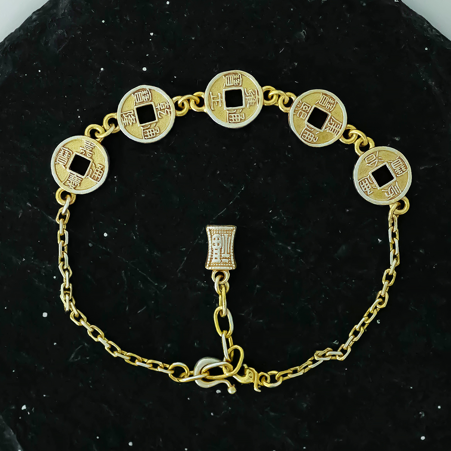 谷满 足银999.9描金珐琅五帝钱铜钱手链新中式纯银七夕精致礼物