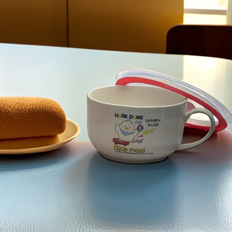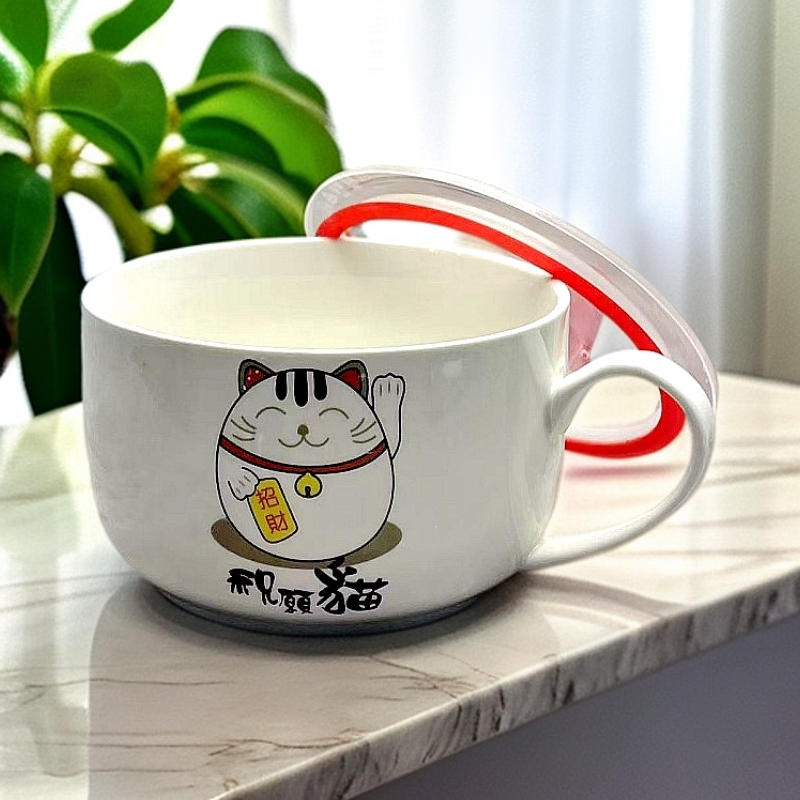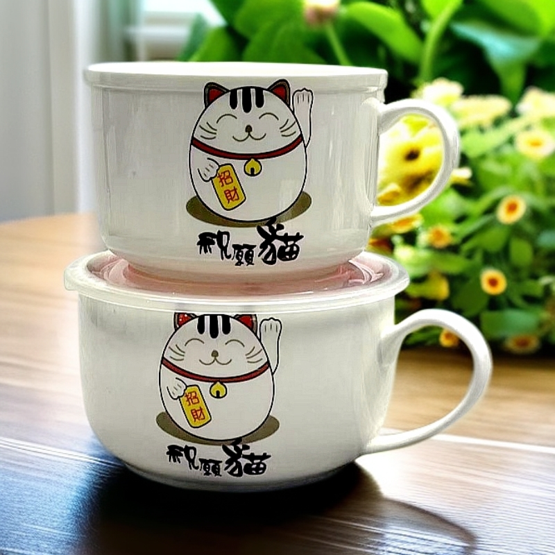 招财猫可爱陶瓷碗带把手泡面碗家用早餐泡面杯大号带盖上班族面碗