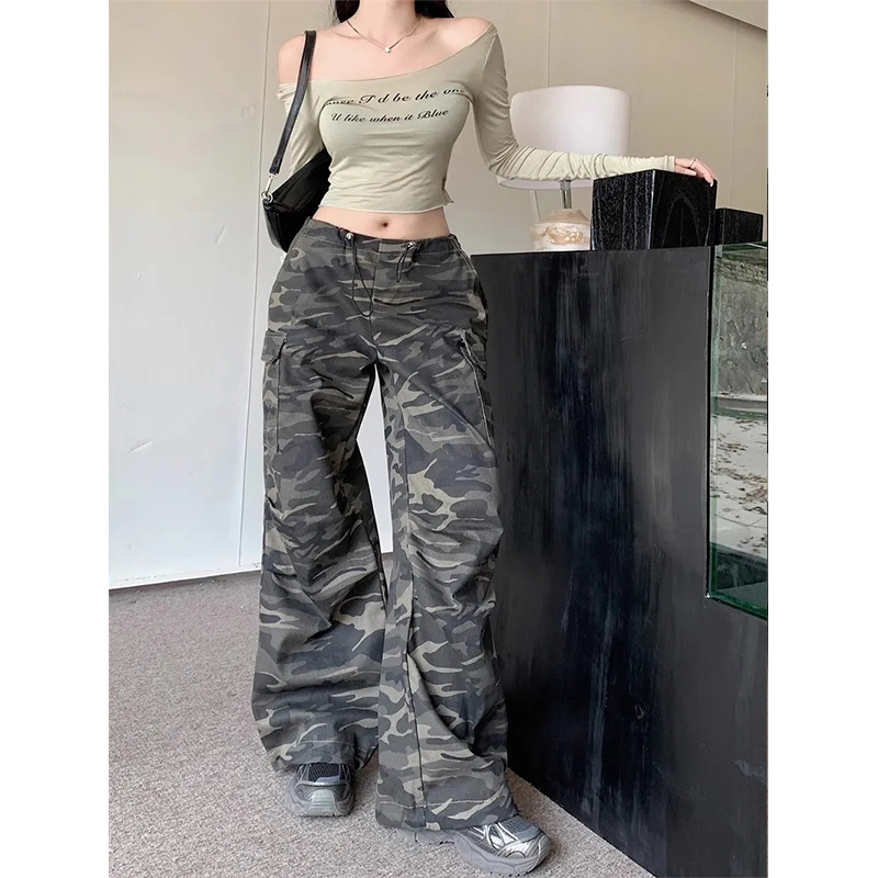 2025新款美式工装裤高街抽绳复古迷彩长裤宽松休闲裤男女直筒裤子
