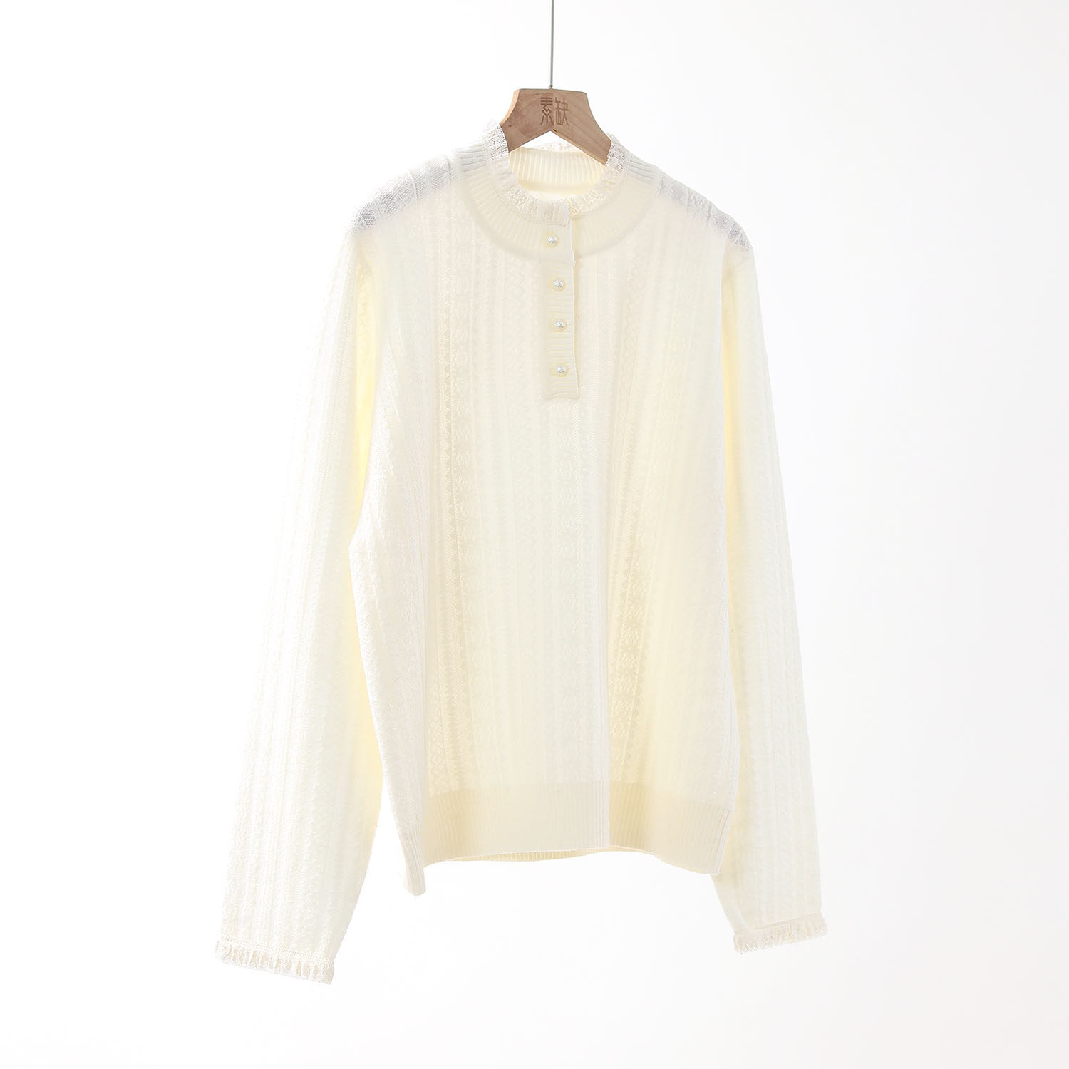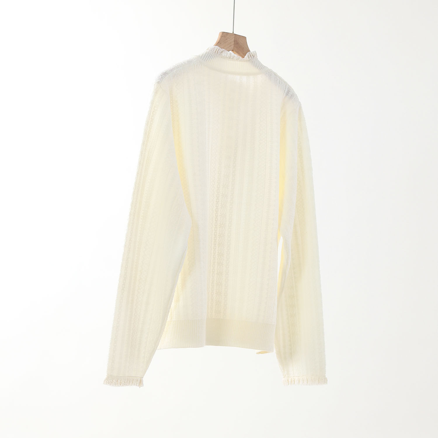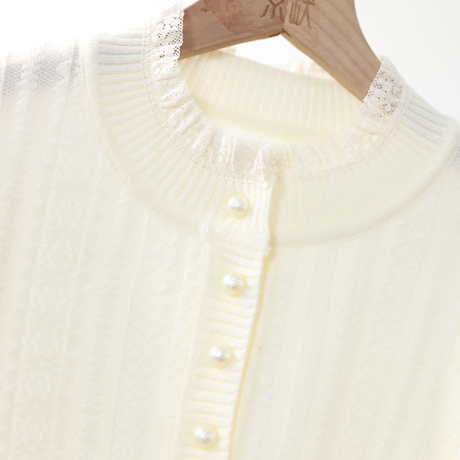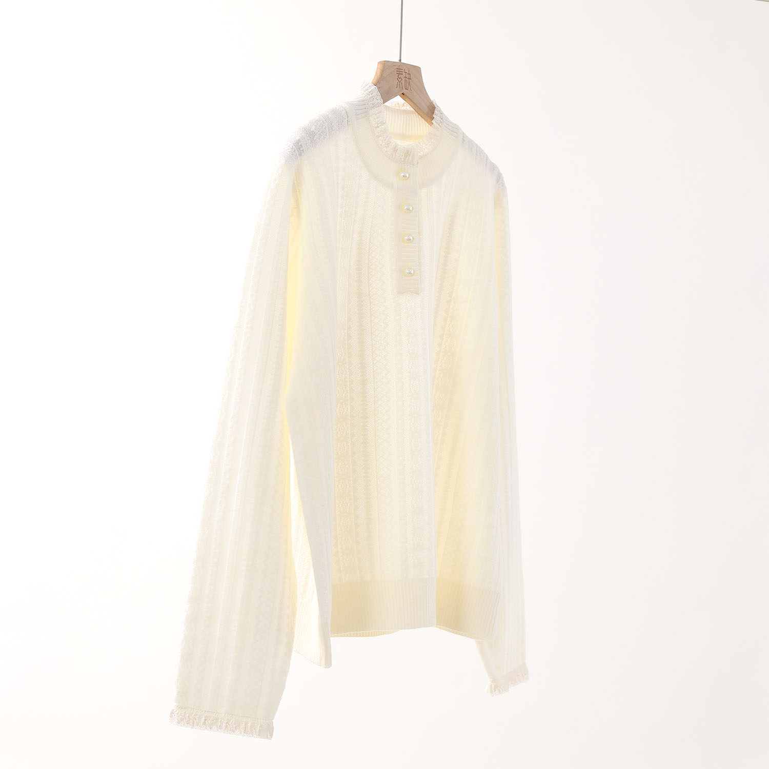 法式温柔风珍珠扣蕾丝花边针织衫女半高领白色洋气百搭套头毛衣