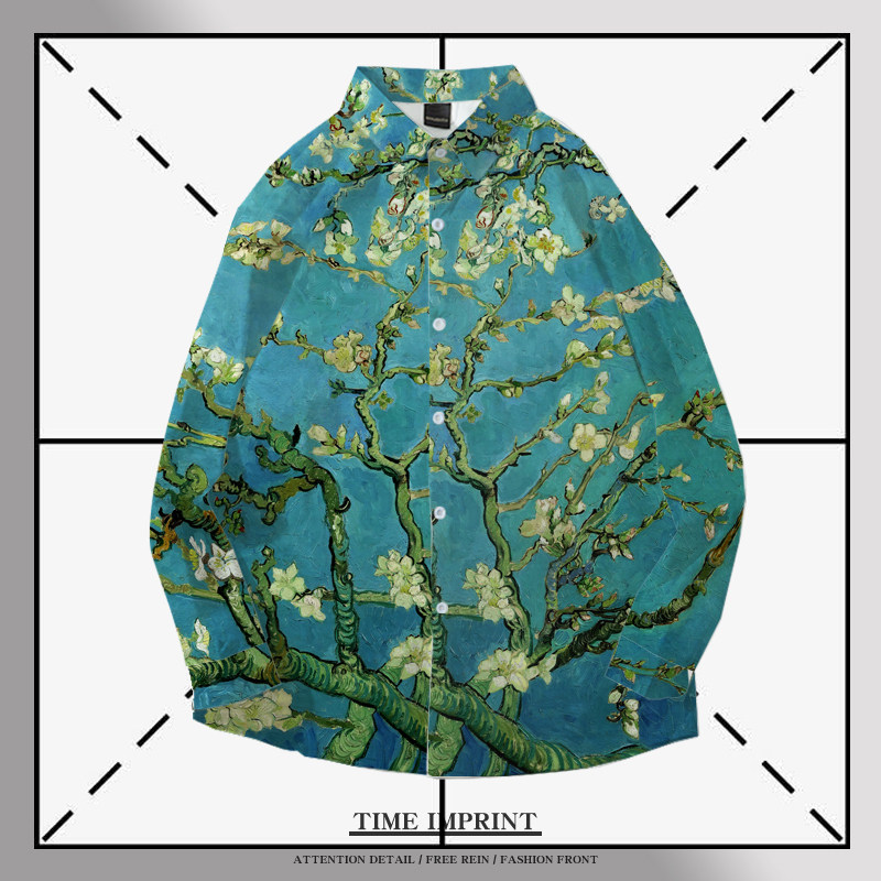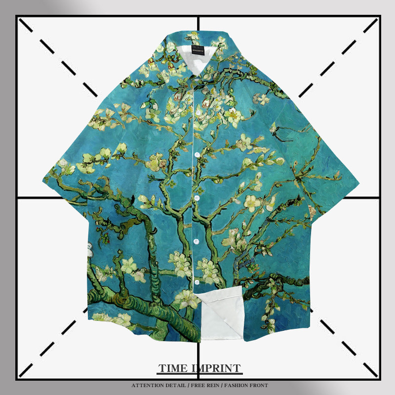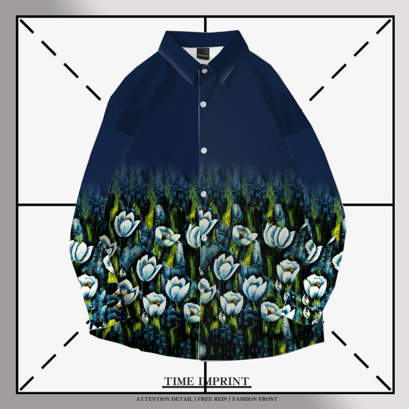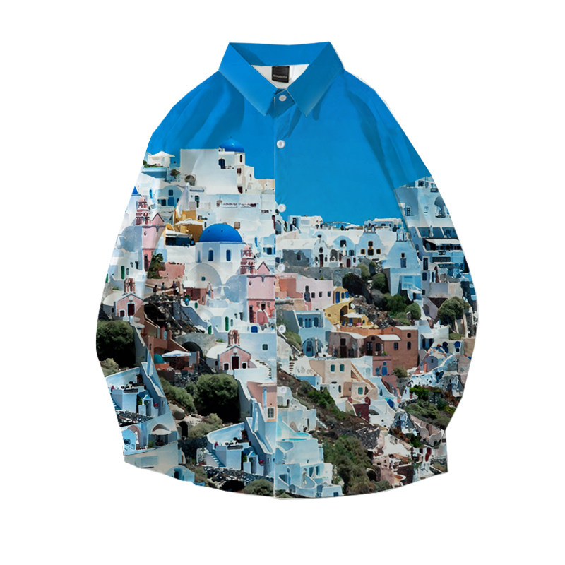 2022春夏印花衬衣宽松落肩学院风蓝色衬衫文艺情侣装翻领上衣沙滩