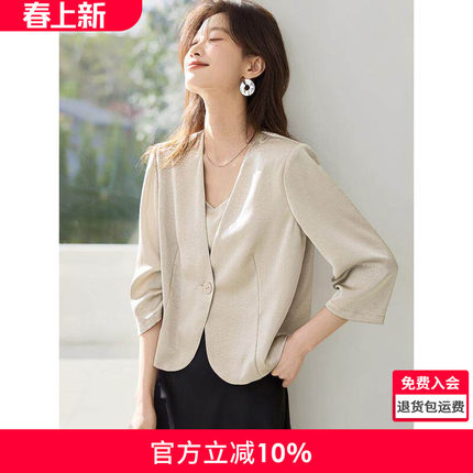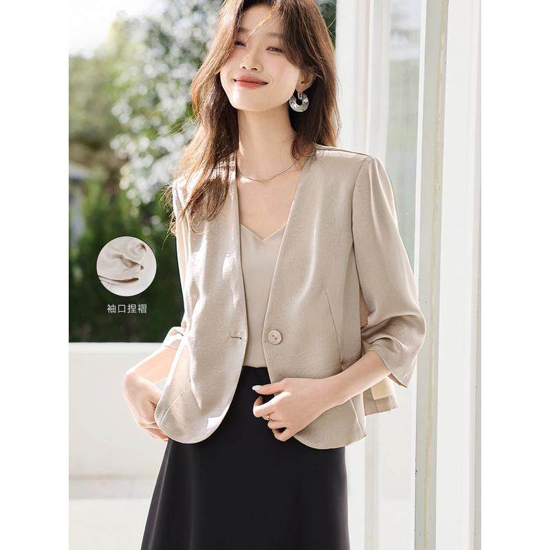沫晗依美气质简约缎面七分袖无领西服2026春季新款通勤西装外套女