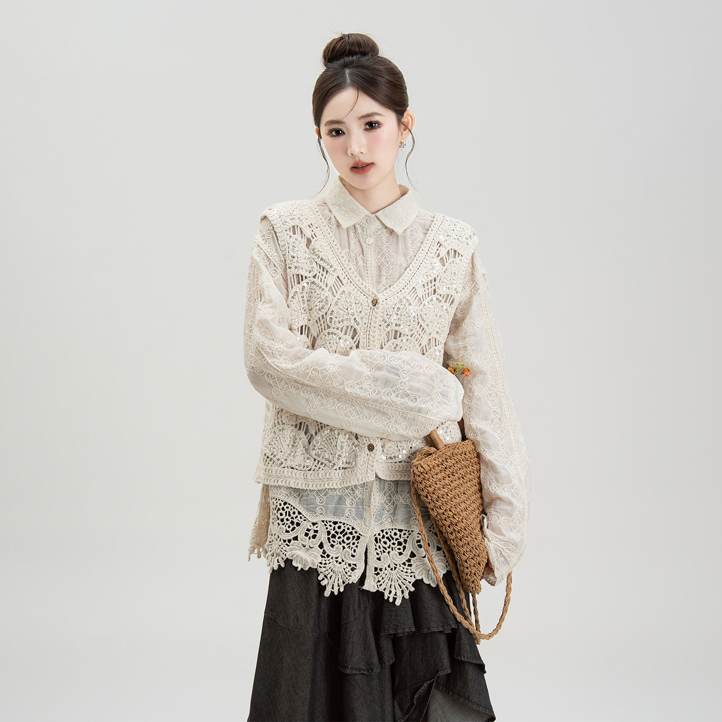 杏色镂空钩花针织马甲背心女夏季新款长袖衬衫不规则半身裙子套装