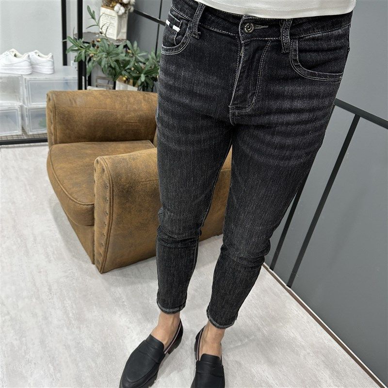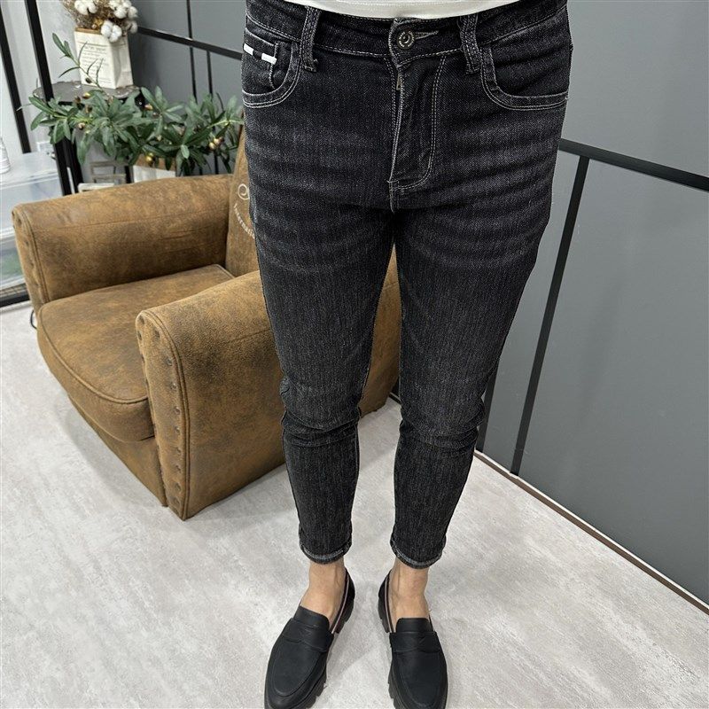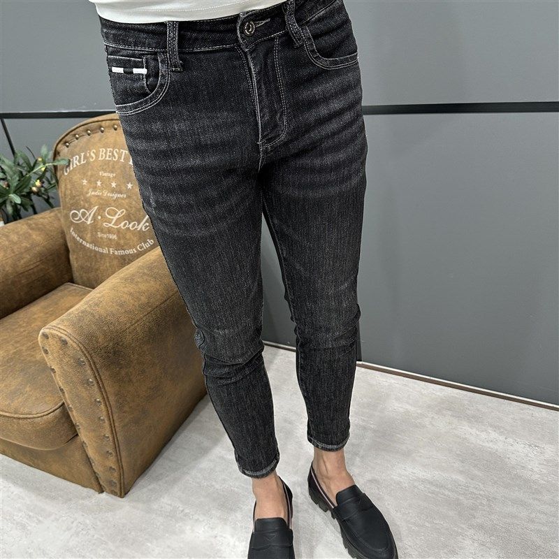 黑色刺绣抓毛加厚水洗弹力修身小脚九分牛仔裤男秋冬潮流休闲长裤