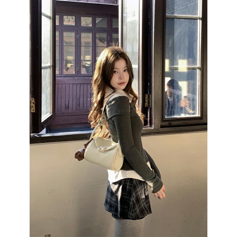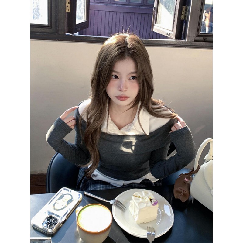 大码辣妹学院风假两件内搭T恤女装秋冬新款高级感拼接polo领上衣